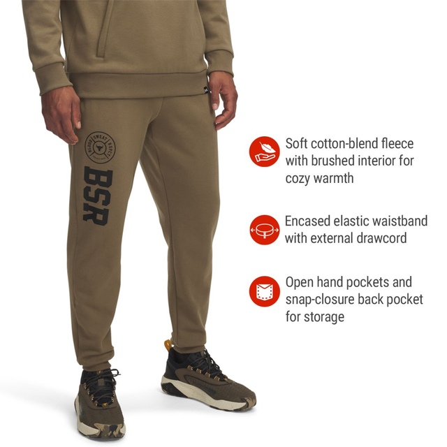 The Under Armour Men's Project Rock Rival BSR Jogger Pants offer the perfect blend of comfort and performance. Made with fleece for added comfort, these joggers keep you ready for any challenge. Built to move with you, they support your push beyond boundaries, ensuring you're always prepared.