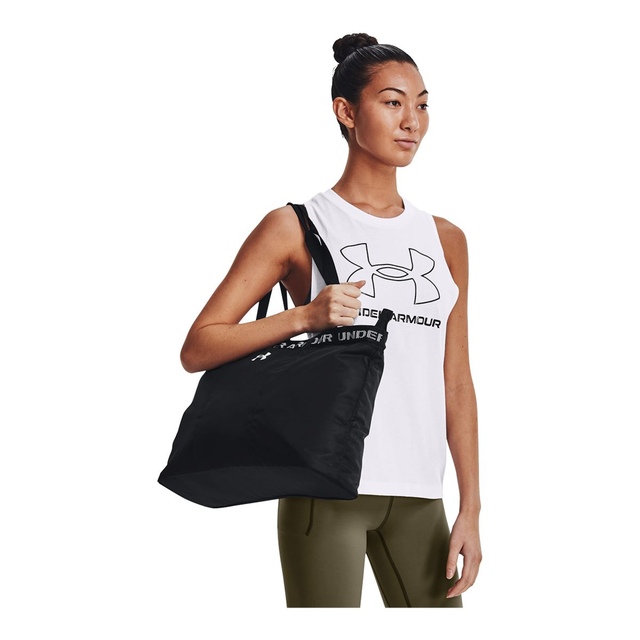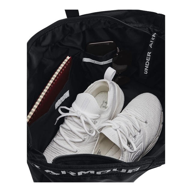 The Under Armour Women's Favorite Tote Bag provides a highly water-repellent finish to protect your belongings. A front slip pocket offers quick access to essentials, and the durable webbing straps allow for comfortable carrying options. This spacious tote features a large zippered main compartment with internal slip pockets for organization.