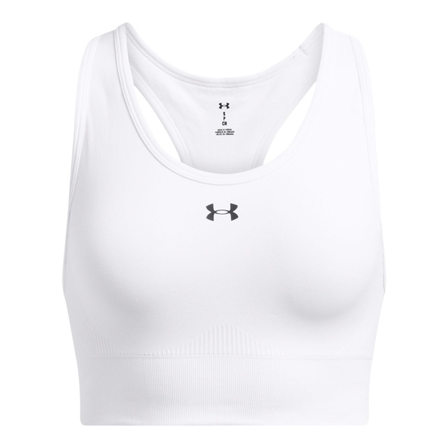 The Under Armor Women's Vanish Seamless Mid Sports Bra offers a chafe-free, compression fit designed for high-impact activities. This sports bra features a seamless construction with ventilated mesh panels that enhance breathability and moisture-wicking HeatGear fabric to keep you cool and dry. Removable cups provide customizable support while the compression fit helps reduce bounce and movement.