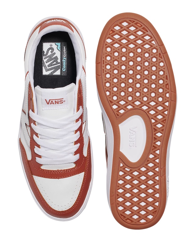 A Standout “Flying V” Logo Brands this Comfy 80s-Inspired Shoe The Lowland ComfyCush is an archival 80s Vans silhouette with a slim profile and a ComfyCush outsole for modernized comfort. Originally designed for tennis in the early 80s when Vans was experimenting with athletic-focused footwear, this low-top style maintains a familiar look while adding the excitement of our heritage “Flying V” Vans logo.