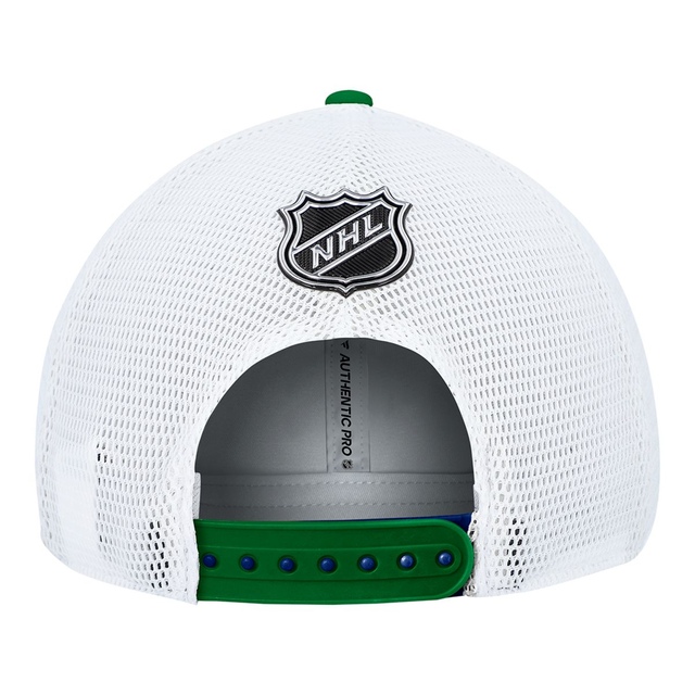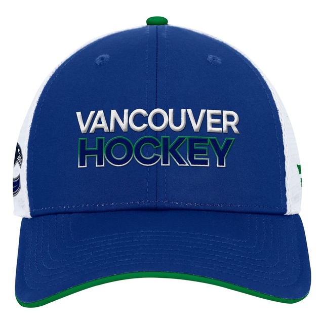 Channel your inner hockey fanatic with the Vancouver Canucks Fanatics Authentic Pro Rink Structured Trucker Cap. This officially licensed NHL headpiece features the team's iconic colors and logo, so you can show off your Canucks pride in style. The structured, adjustable trucker design delivers a customized fit, while the breathable mesh back keeps you cool whether you're cheering courtside or hitting the rink. With its classic look and team spirit, this cap is the perfect accessory for any Canucks super-fan looking to elevate their gameday gear. Go Canucks!