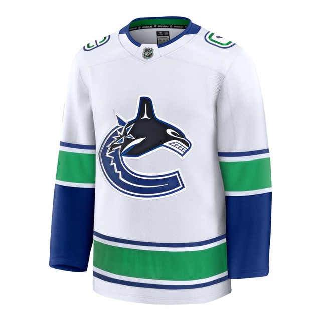The Vancouver Canucks Fanatics Premium Away Jersey offers hockey fans an authentic look and feel. It features a sewn down tackle twill embroidered with the team crest and shoulder patches captures authentic detailing, molded after what the players wear on the ice. The holographic NHL shield and Fanatics flag certify its official NHL licensing, perfect for Canucks fans to showcase their pride.