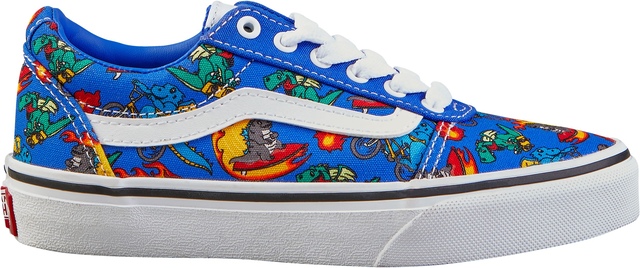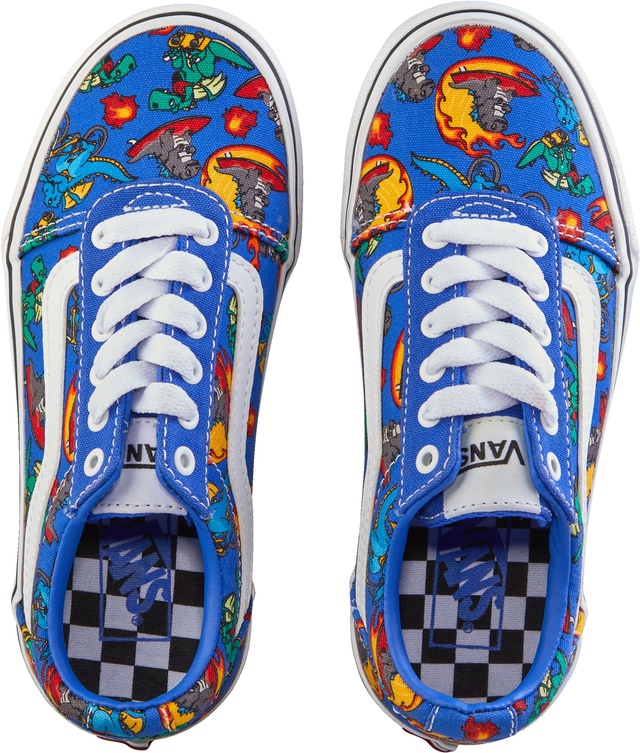 Built with Van's instantly recognizable sidestripe, the Kids Dragon Explorer Ward blends iconic Vans branding, heritage details, and vulcanized construction for a low top shoe filled with classic cool. The sturdy canvas uppers feature a gnarly allover dragon print, and the padded collars offer flexibility and support. Their famous signature rubber waffle outsoles round out the timeless design of this lace-up shoe.