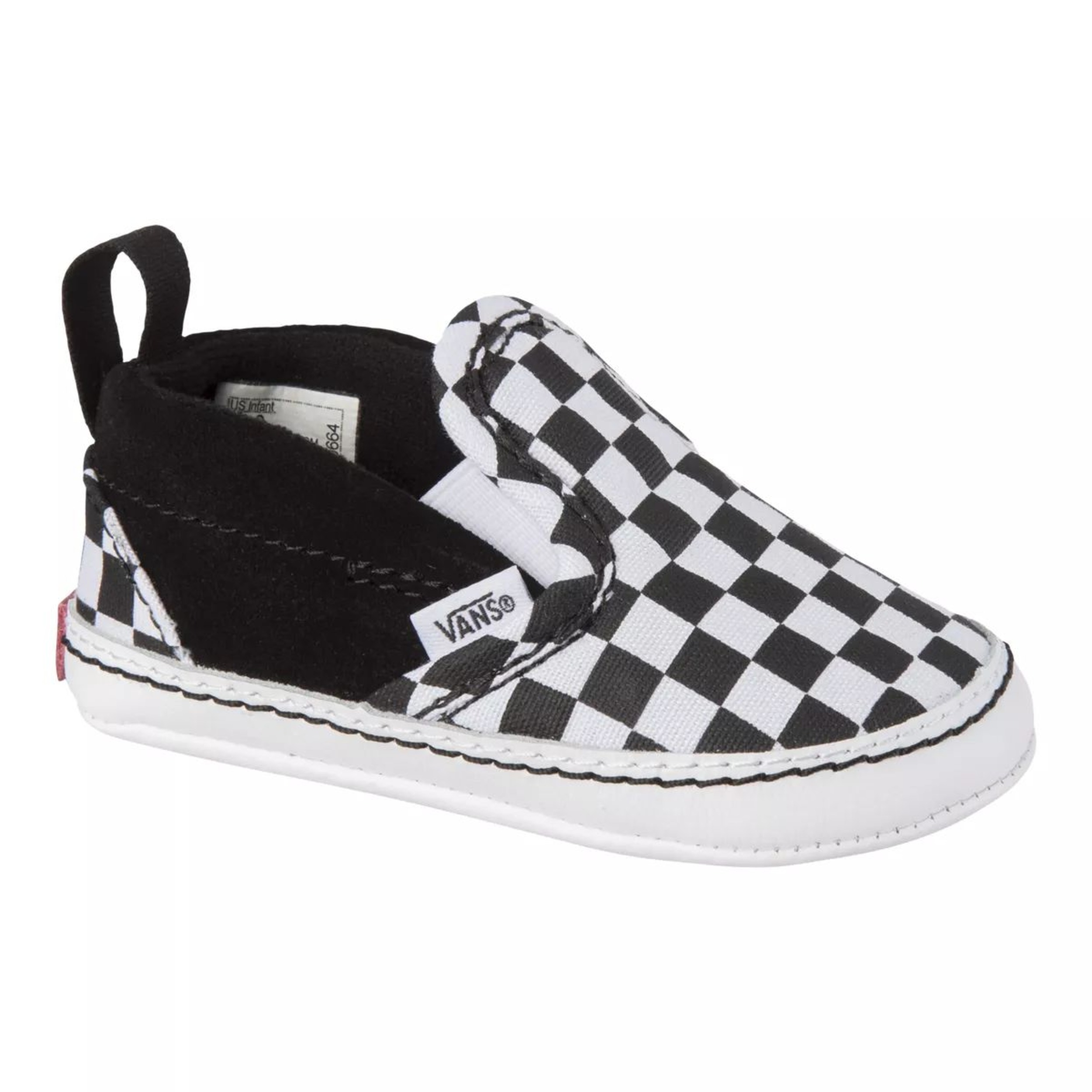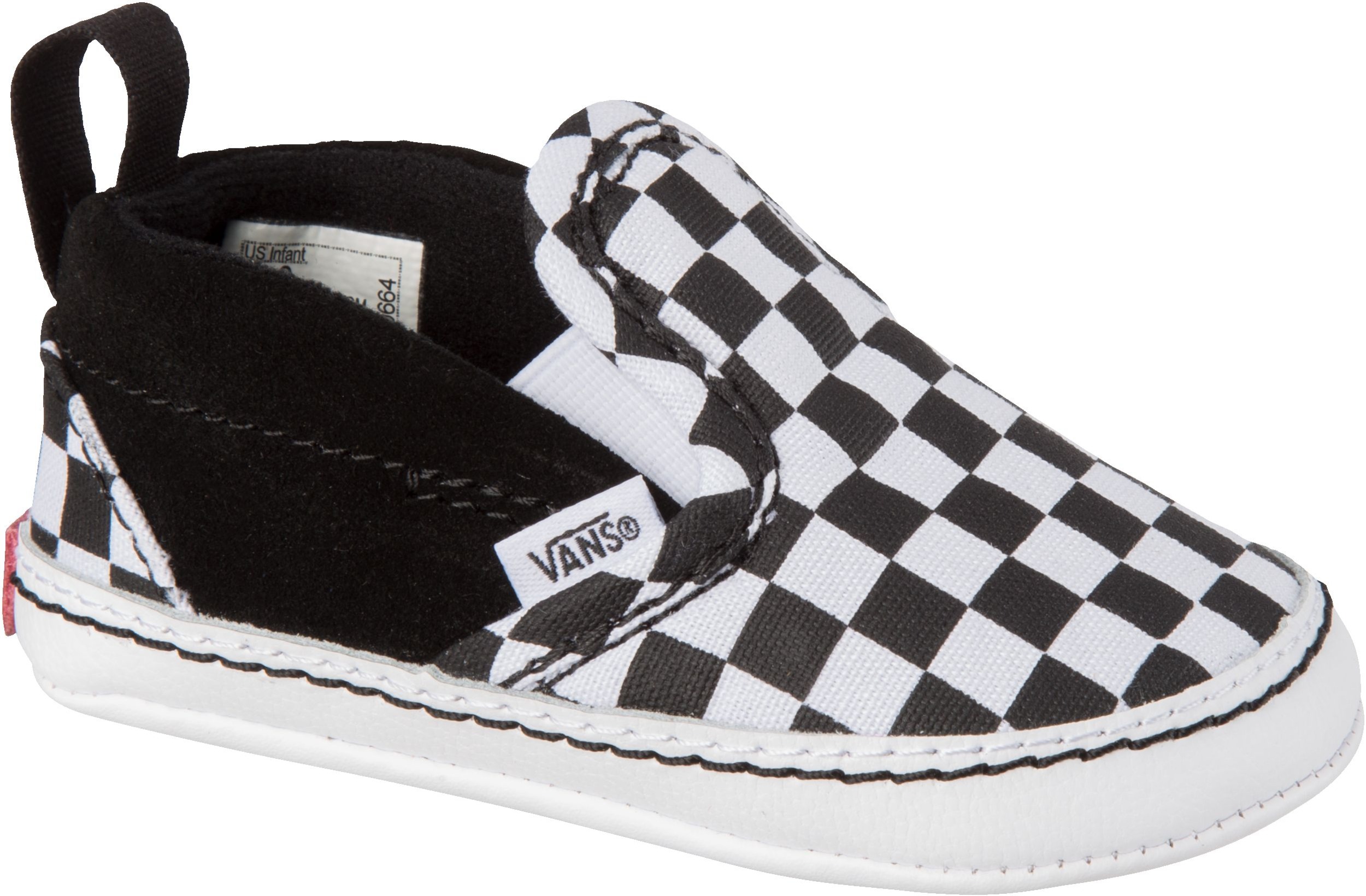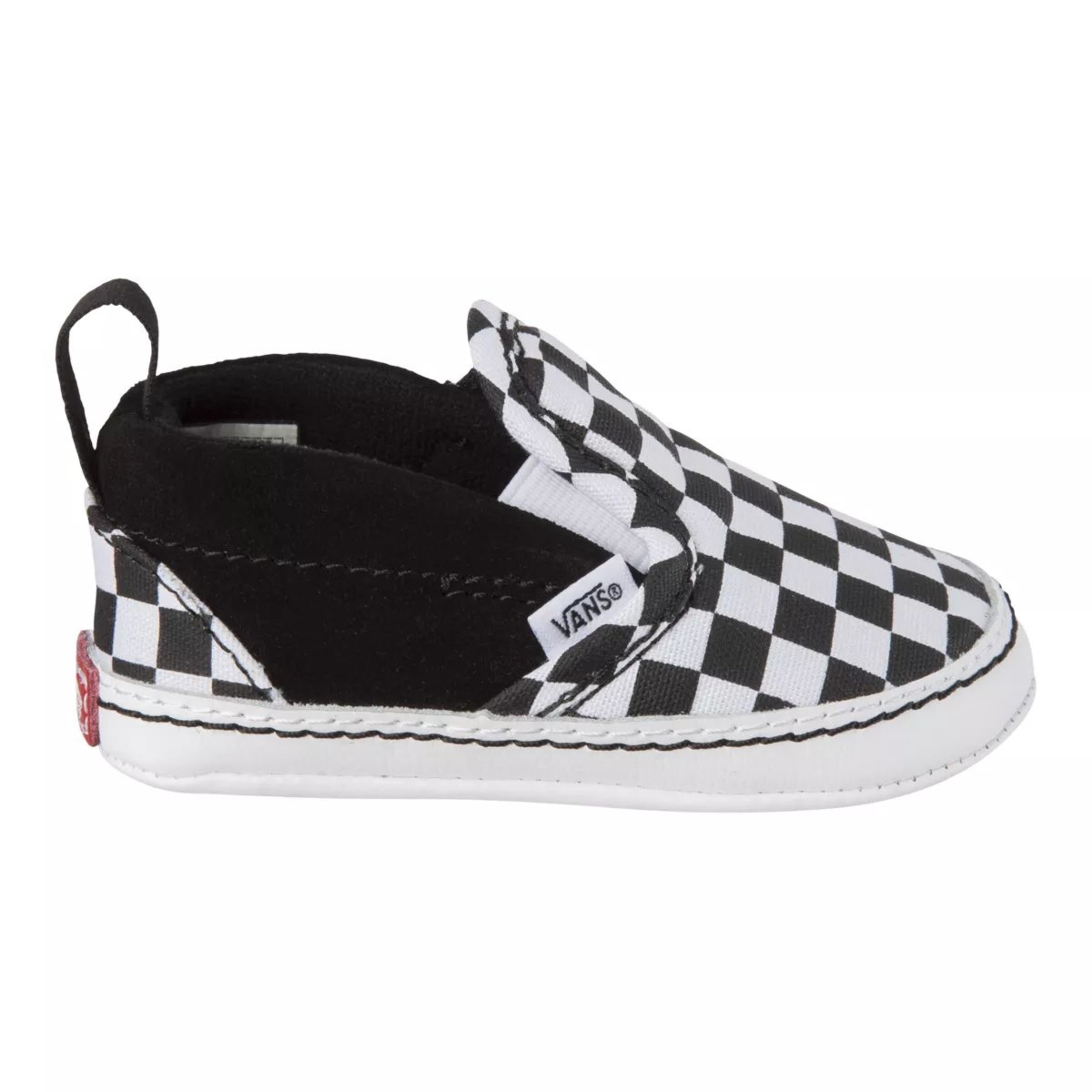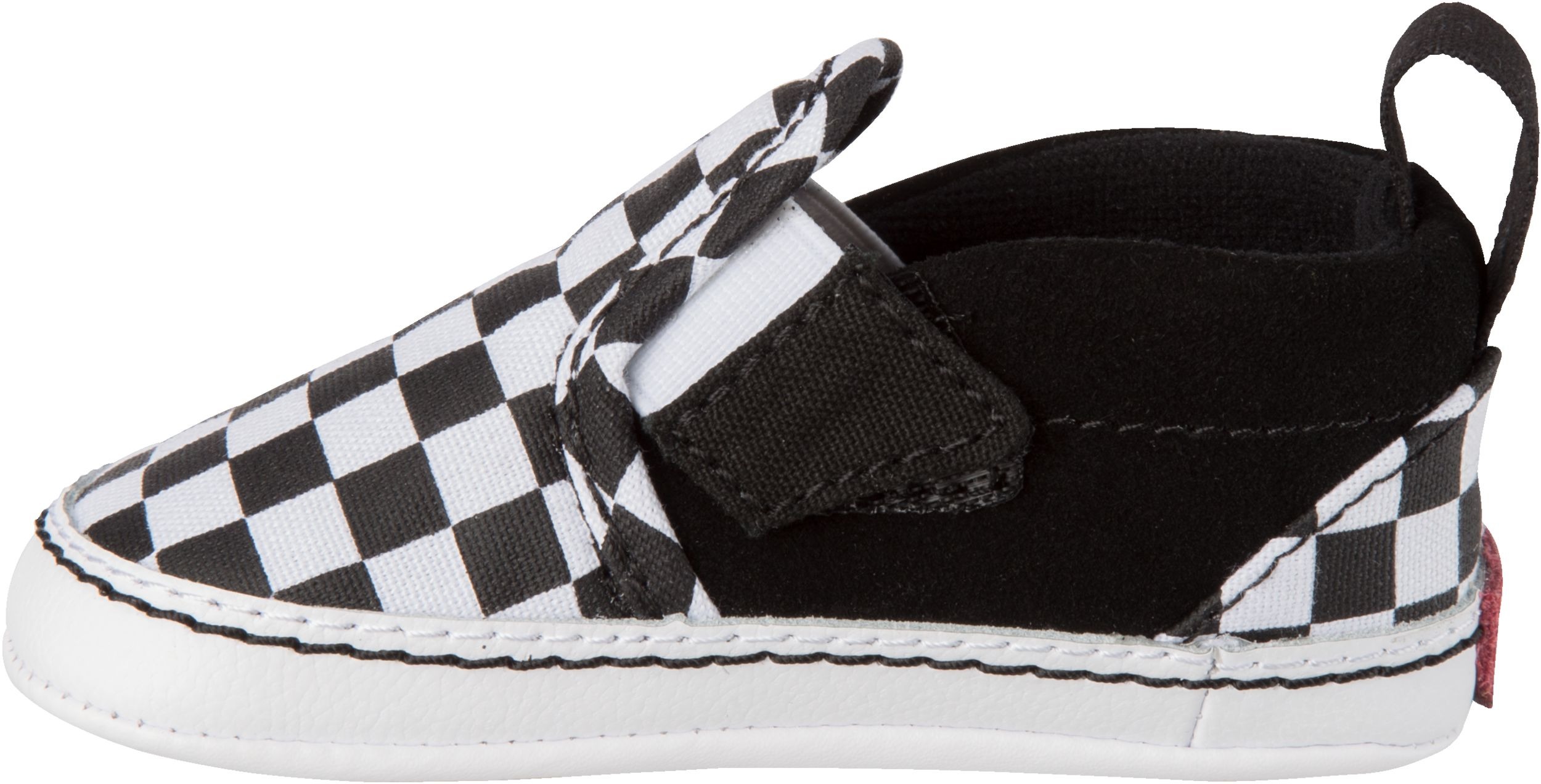 The Vans Kids' Toddler V Crib Slip On Shoes offer a classic slip-on style redesigned for little feet. Crafted with sturdy suede and canvas uppers featuring the iconic Checkerboard print, these Vans baby shoes boast elastic side accents and heel pulls for easy on and off. A new printed outsole mimics the signature Vans waffle tread, while the heel scab adds an authentic touch. These Vans shoes offer superior comfort for your little ones.