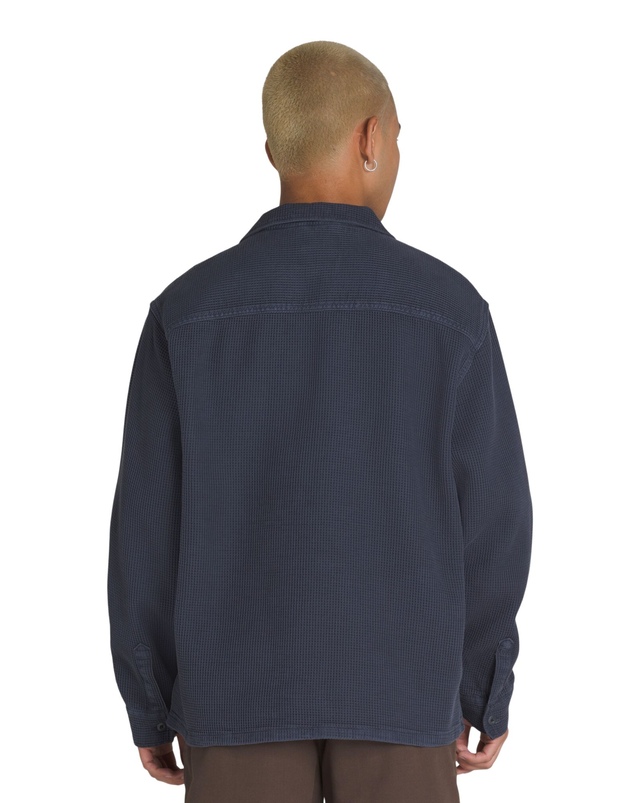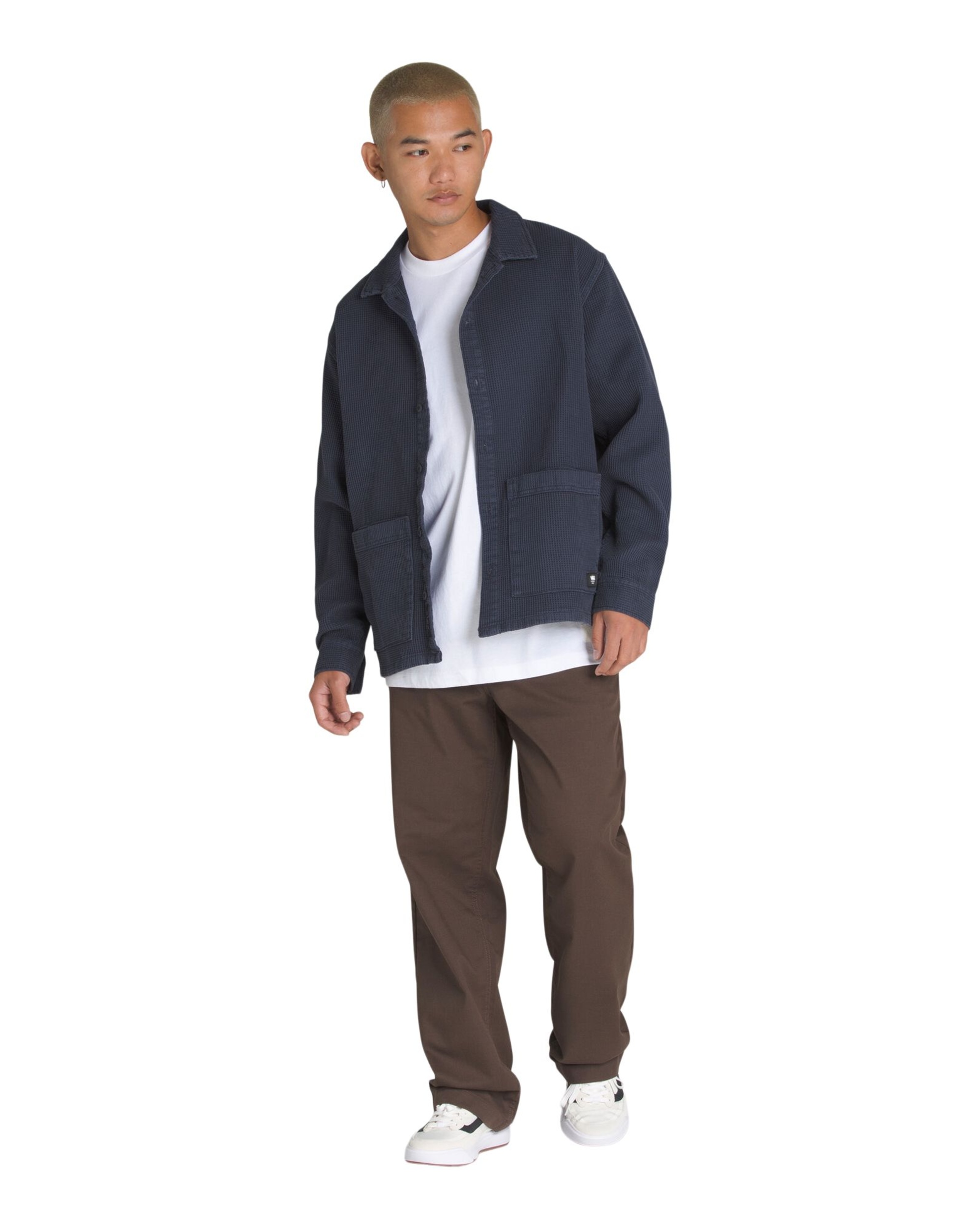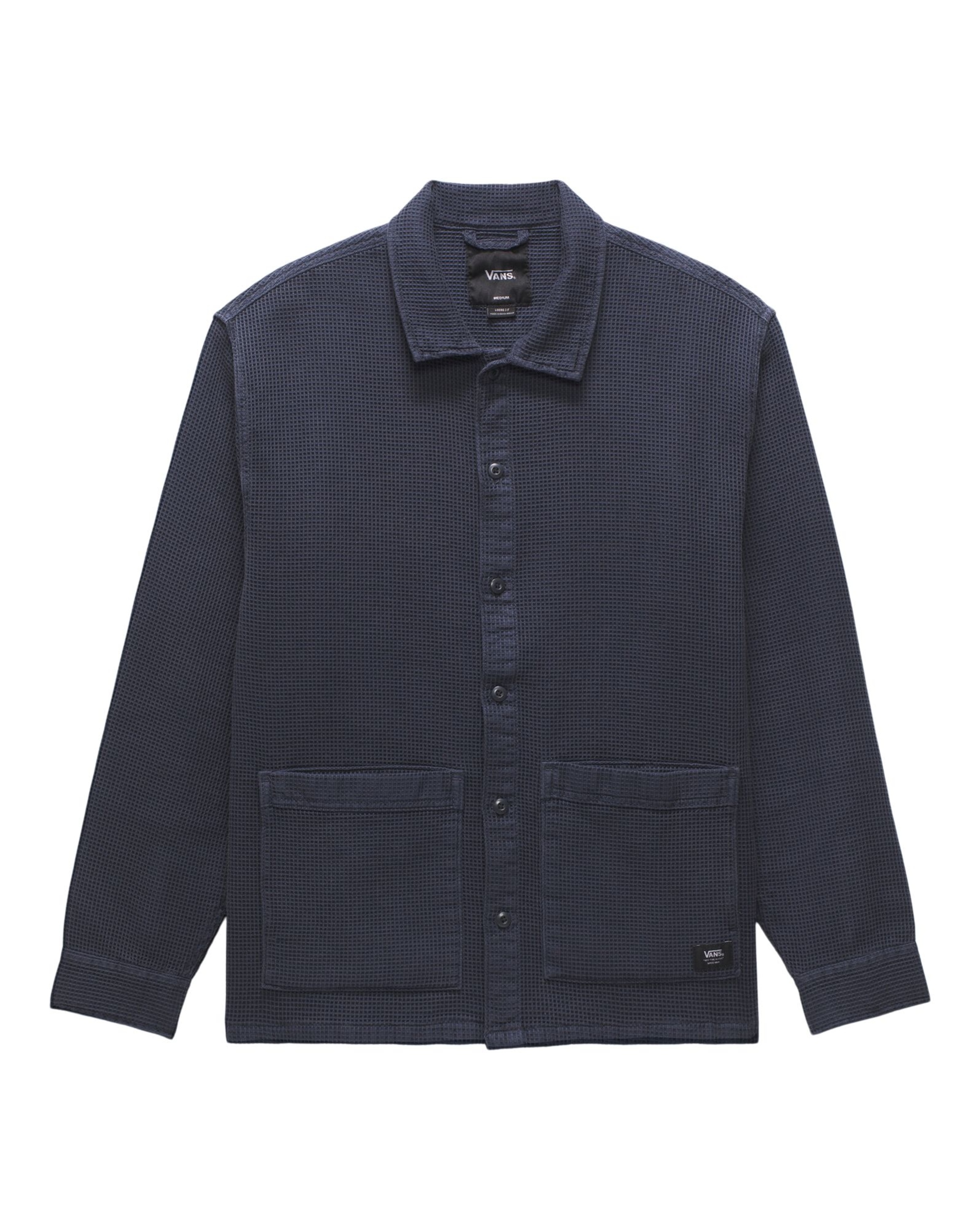 The Vans Men's Maywood Dobby Shacket offers versatile style for transitional seasons. Crafted from 100% cotton dobby fabric with a pigment dye, this shacket features a subtle geometric pattern that adds visual interest. Designed for a relaxed, loose fit, it boasts double layer hand pockets with the iconic Vans woven flag label for signature style.