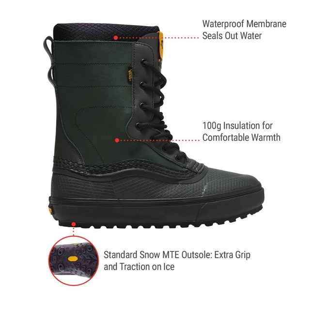 The Vans Men's Standard Snow MTE Non-Slip Boots combine style with weatherproof performance. Featuring a waterproof vulcanized design and heavy-duty felt liner, these boots provide warmth and protection. The Standard Snow MTE outsole, with its aggressive reverse waffle lug pattern and siped tire-like design, offers superior traction on variable terrain. With 100g insulation and seam-sealed construction, they keep you dry and ready for winter adventures.