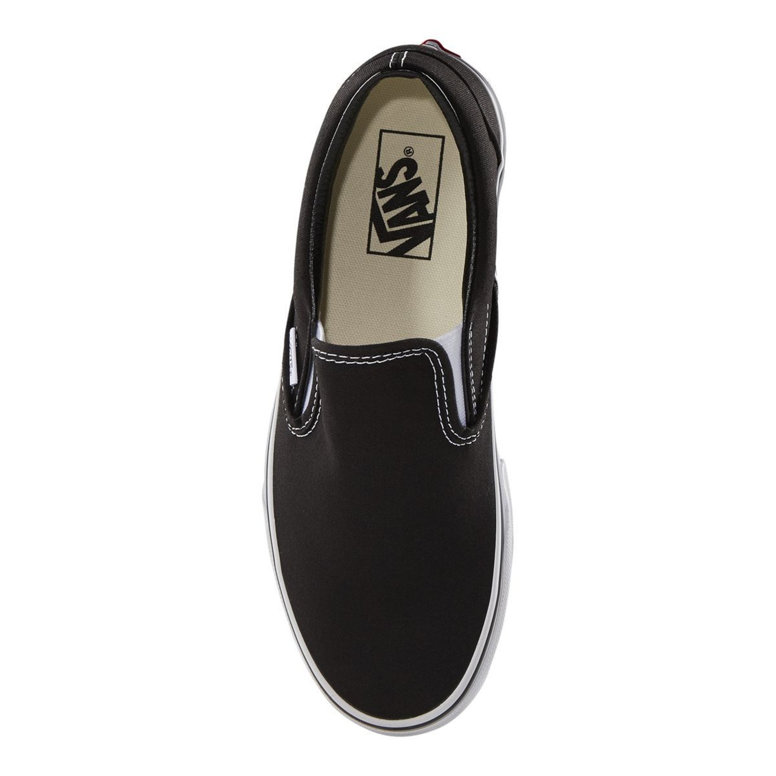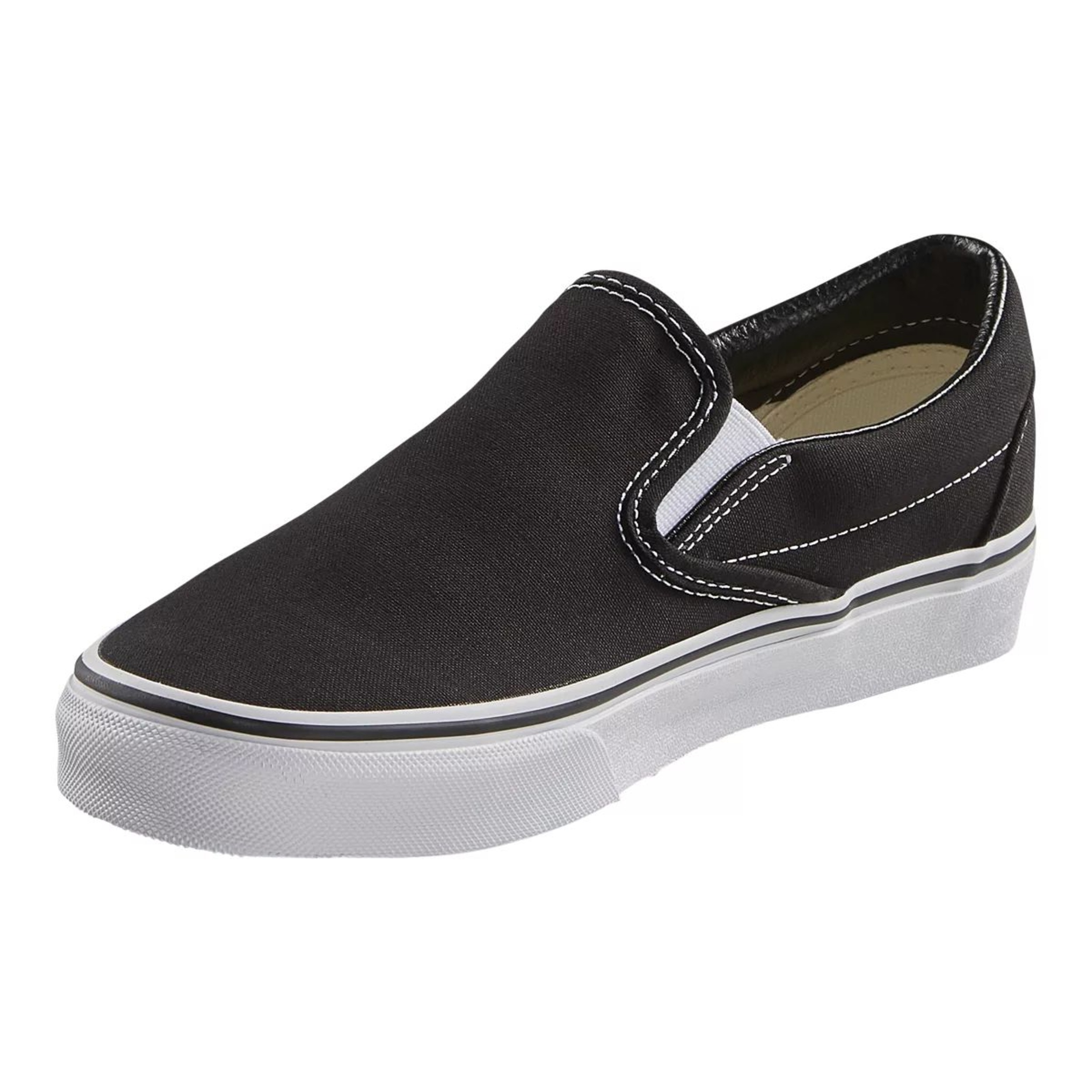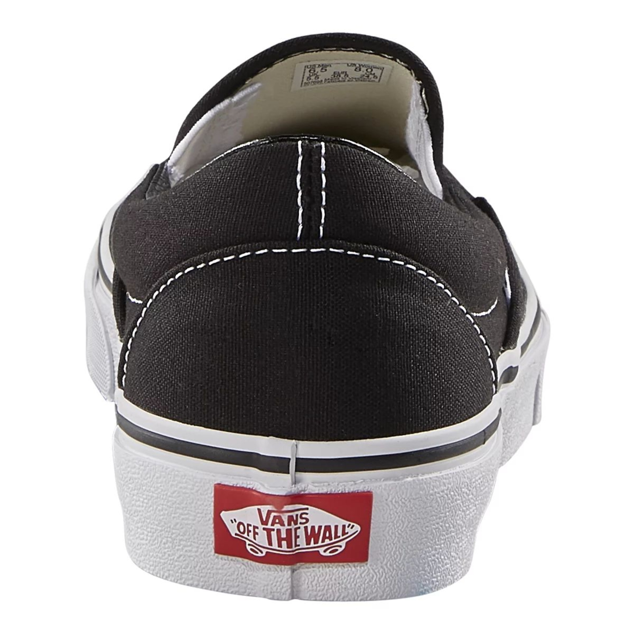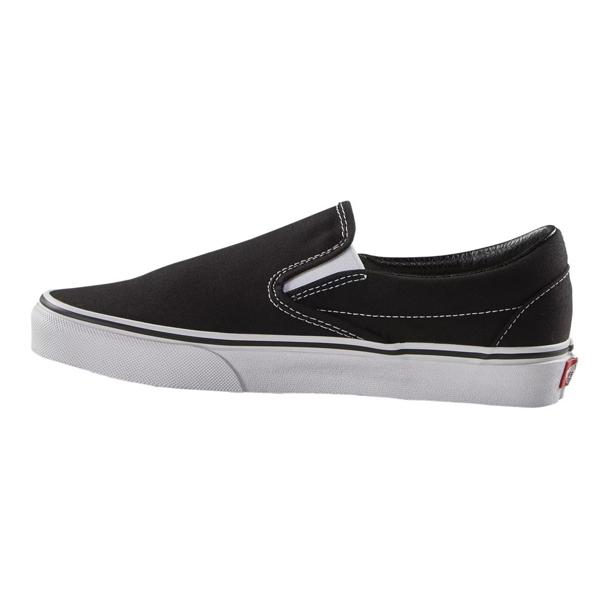 The Classic Slip On features sturdy low profile slip-on canvas uppers, padded collars, elastic side accents, and signature rubber waffle outsoles.