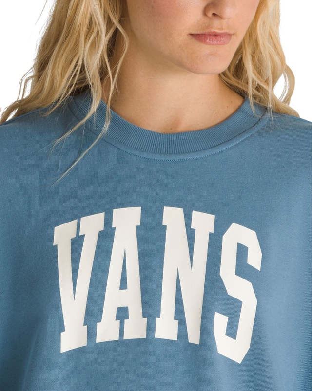 The Vans Women's Stadium Loose Sweatshirt is a relaxed-fit, long sleeve crewneck crafted from a soft, heavyweight cotton-blend French terry fabric. This cozy sweatshirt features a bold screen-printed Vans® logo emblazoned across the chest, adding a stylish touch to the classic design.