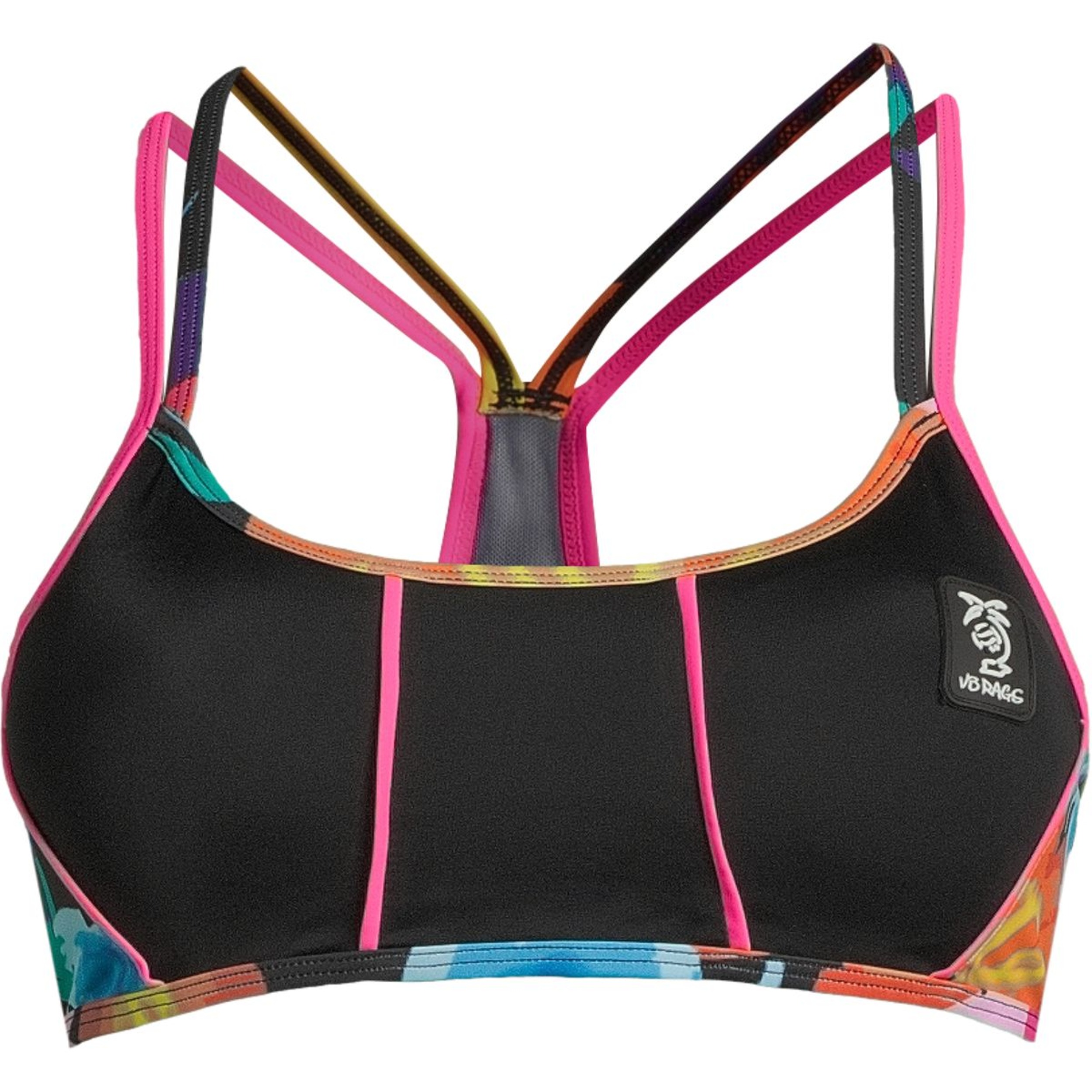 The VB Rags Women's Belmar Volleyball Bikini Top is a sporty bikini top that is perfect for any hard hit. This racer back has a mesh spandex fabric and removeable cups, that are easy to wash and a perfect addition to your athletic collection. This sports bra was made to play beach volleyball.