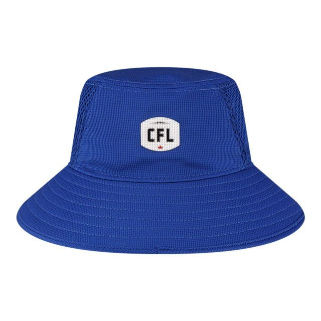 Winnipeg Blue Bombers Sideline bucket cap. Team colour pivot mesh and stretch mesh fabrication. Bombers primary logo patch on front complimented by a reflective city wordmark. Liquid chrome CFL badge on the back. Adjustable drawstring is removable.
