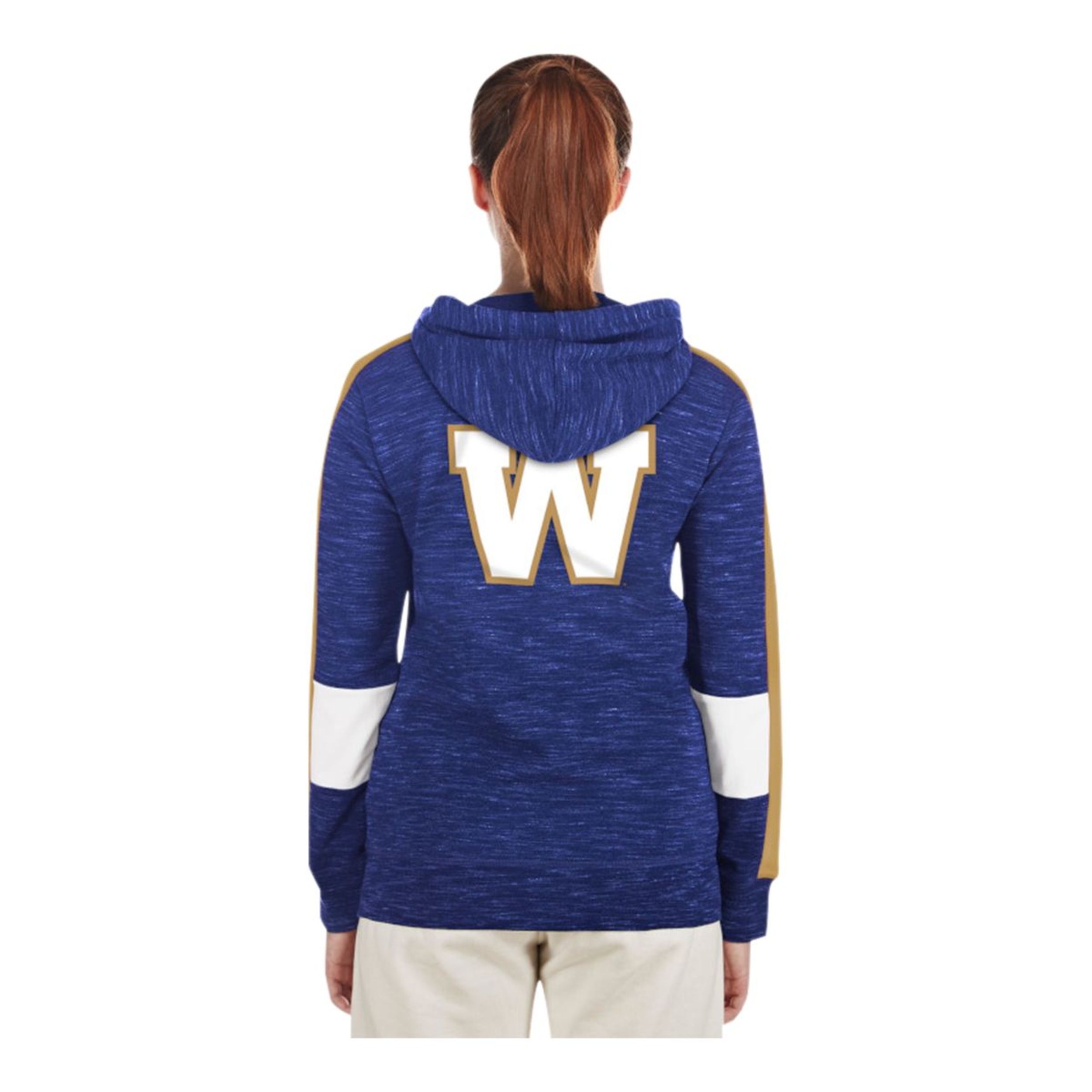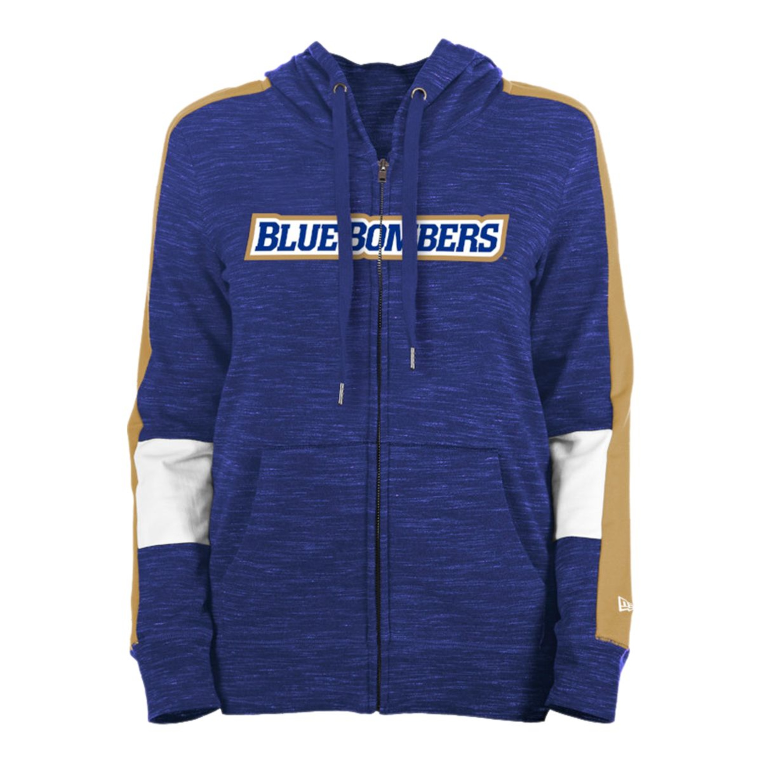 Winnipeg Blue Bombers women's CFL full-zip hooded sweatshirt. Team Color space-dye fabrication with secondary team color striping down the outside of sleeves. Bombers wordmark screened across the front chest, and large team primary logo screen-printed on the back.
