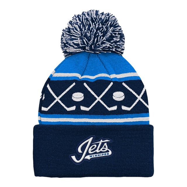 The Winnipeg Jets Outerstuff Infant Face Off Cuff Pom Knit Beanie keeps your little fan warm while showing off team pride. Designed in team and alternate colours, it features a hockey stick and puck jacquard pattern. An embroidered logo on the front and the team name on the back add a bold touch. Finished with a mixed-colour pom.