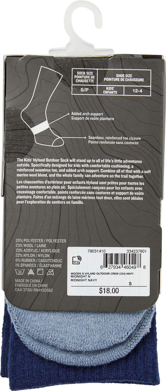 The Woods Girls' Hyland Outdoor Crew Socks are expertly crafted with a reinforced seamless toe, added arch support and comfortable cushioning. These Woods crew-height socks are crafted from a soft Merino wool blend for lasting warmth and comfort on the trails.