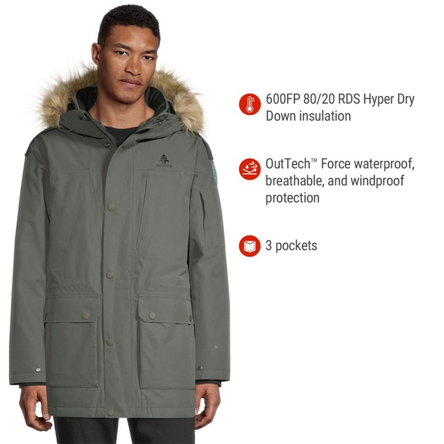 Stay cozy in cold weather wearing the Woods Men's Avens Down Jacket. Featuring OutTech Force waterproof, windproof and breathable protection, plus 600 Fill Power Allied Feather and Down Duck Down insulation for comfort in the winter weather . This Woods jacket has a faux-fur-trimmed hood, an internal wind skirt and multiple secured pockets.