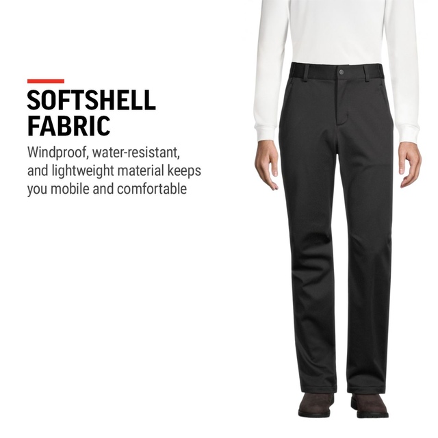 The Woods Men's Pierrway Outdoor Softshell Pants keep you comfortable during outdoor adventures. These durable pants feature a windproof and water-resistant shell, enhanced by C0 DWR treatment for superior protection. Designed with lightweight four-way stretch fabric and a soft fleece backing, they offer exceptional comfort and mobility for activities like hiking and skiing. With articulated knees and adjustable hems, the Woods men's outdoor pants ensure a perfect fit.
