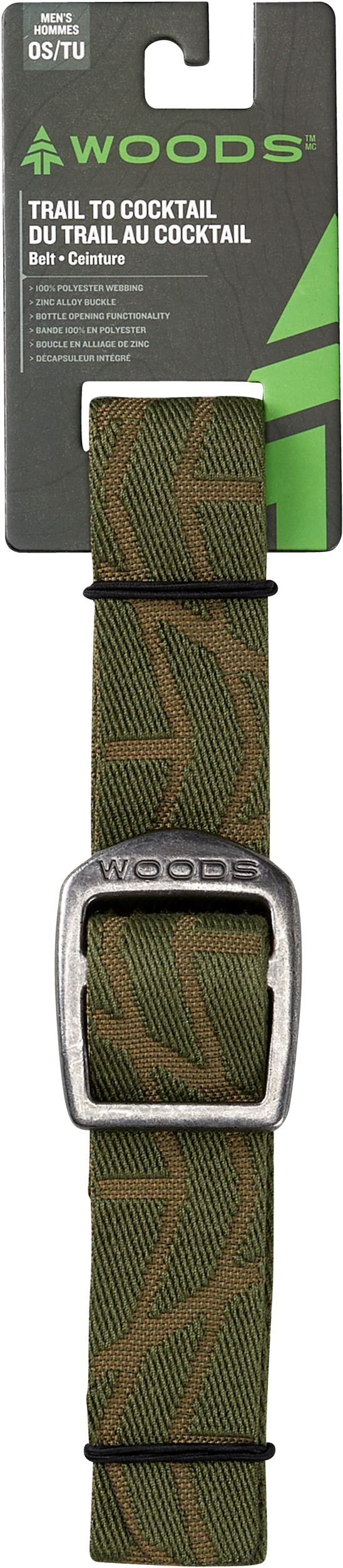 Featuring a 100% polyester construction and a zinc-alloy etched buckle, the Woods Men's Trail to Cocktail Belt takes you from afternoon hike to happy hour with style. The secure slider buckle makes for convenient on and off, while the handy bottle opener blends fashion and function.