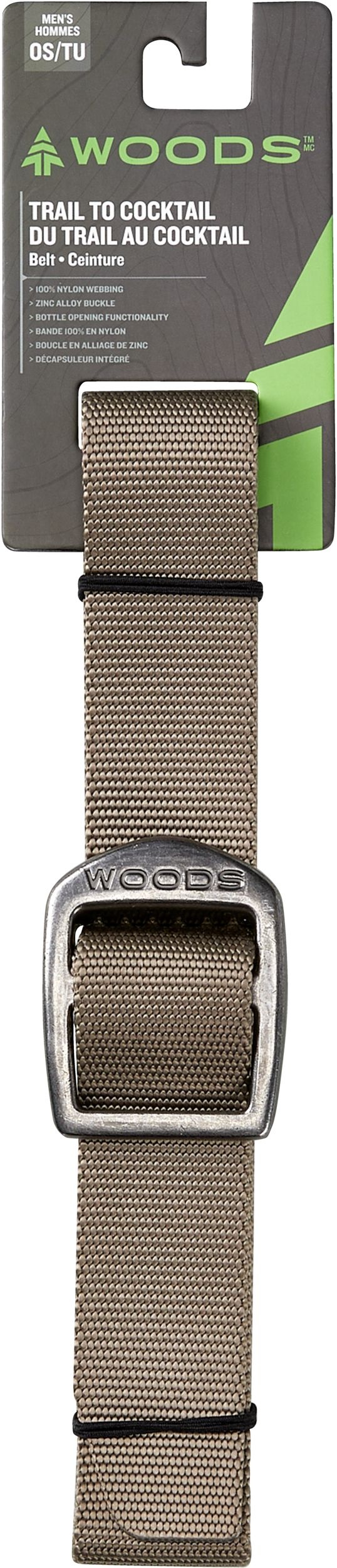 The Woods Trail To Cocktail Belt offers versatility for outdoor activities and casual settings. Made from durable 100% nylon with a zinc alloy clamp buckle, it provides reliable support throughout the day. The Woods belt's standout feature is its integrated bottle opener, which adds convenience for post-adventure refreshments.