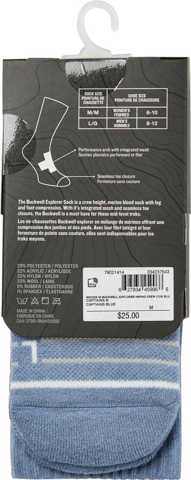 Complement your hiking shoes with these comfy Woods Women's Buckwell Explorer Crew Socks. Featuring a seamless toe, performance arch with integrated mesh, and engineered compression, these socks ensure superior support and breathability. Ideal for extended treks, the crew height of these Woods socks offers added protection and a snug fit.
