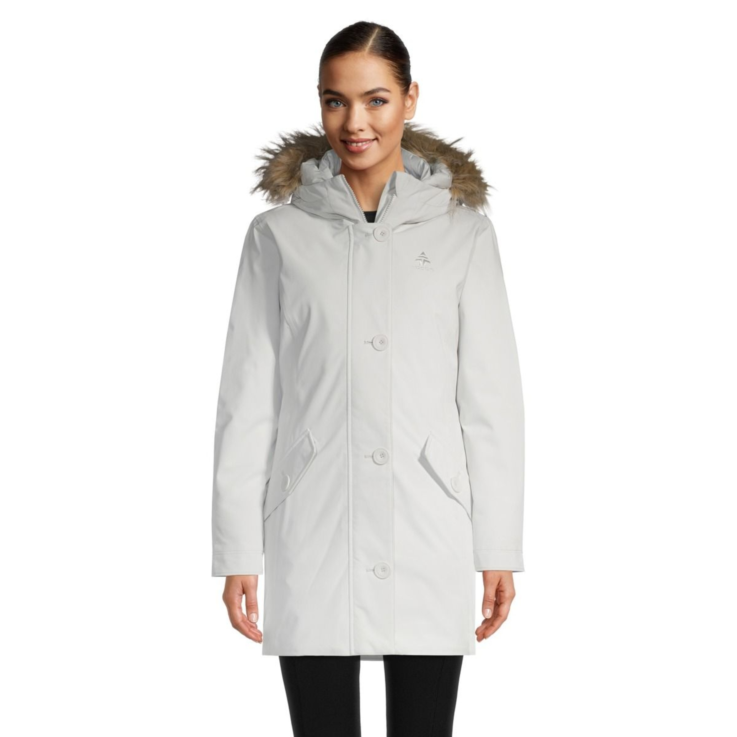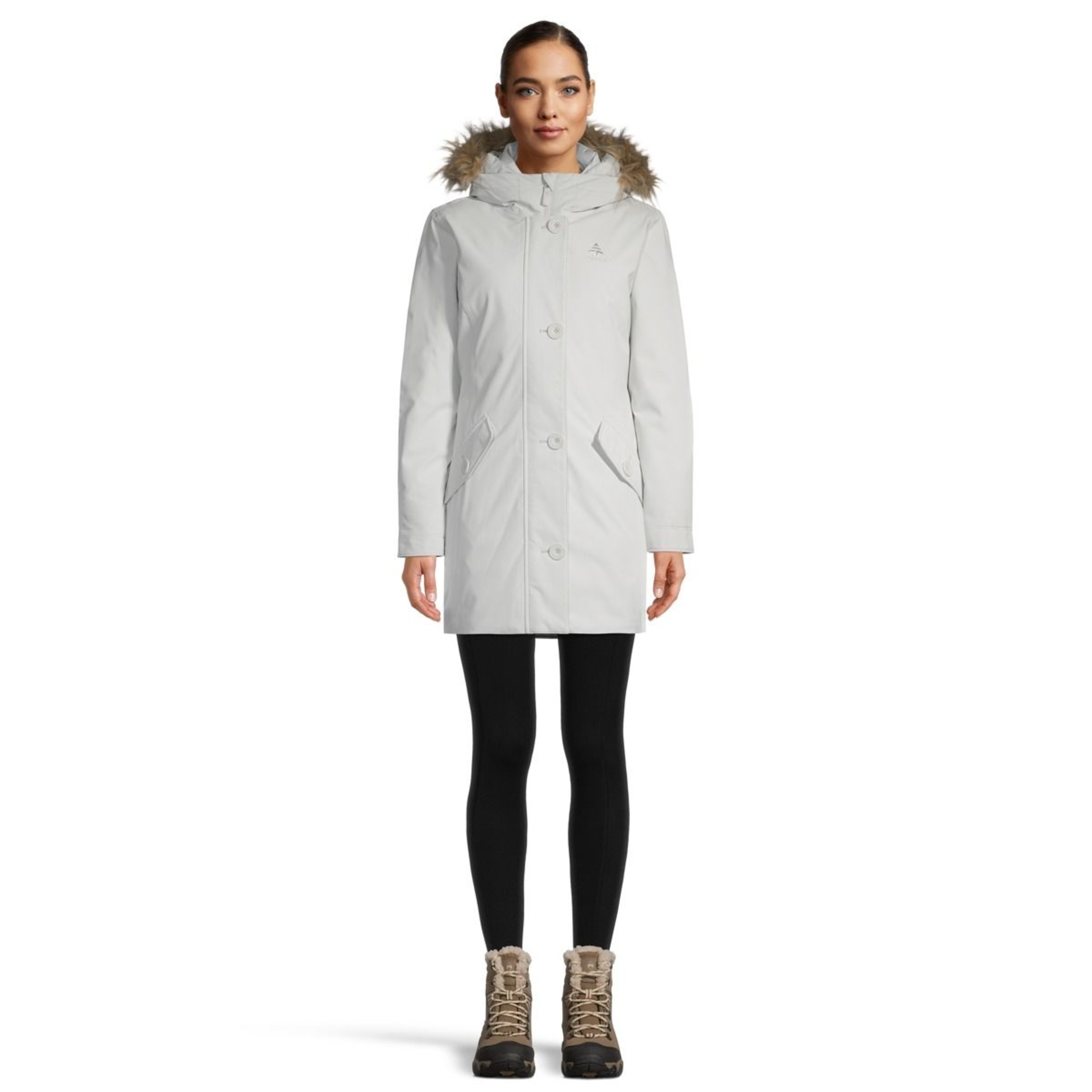 The Woods Women's Finlayson Parka Jacket is a mid-length winter coat featuring premium down insulation and OutTech Force waterproof, breathable technology for optimal protection against the elements. Made from 35% recycled polyester, it offers sustainable warmth. The adjustable hem and waist provide a customized fit. This Woods winter jacket is fashionable and functional, designed to turn heads.