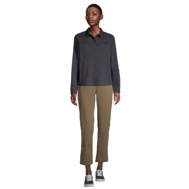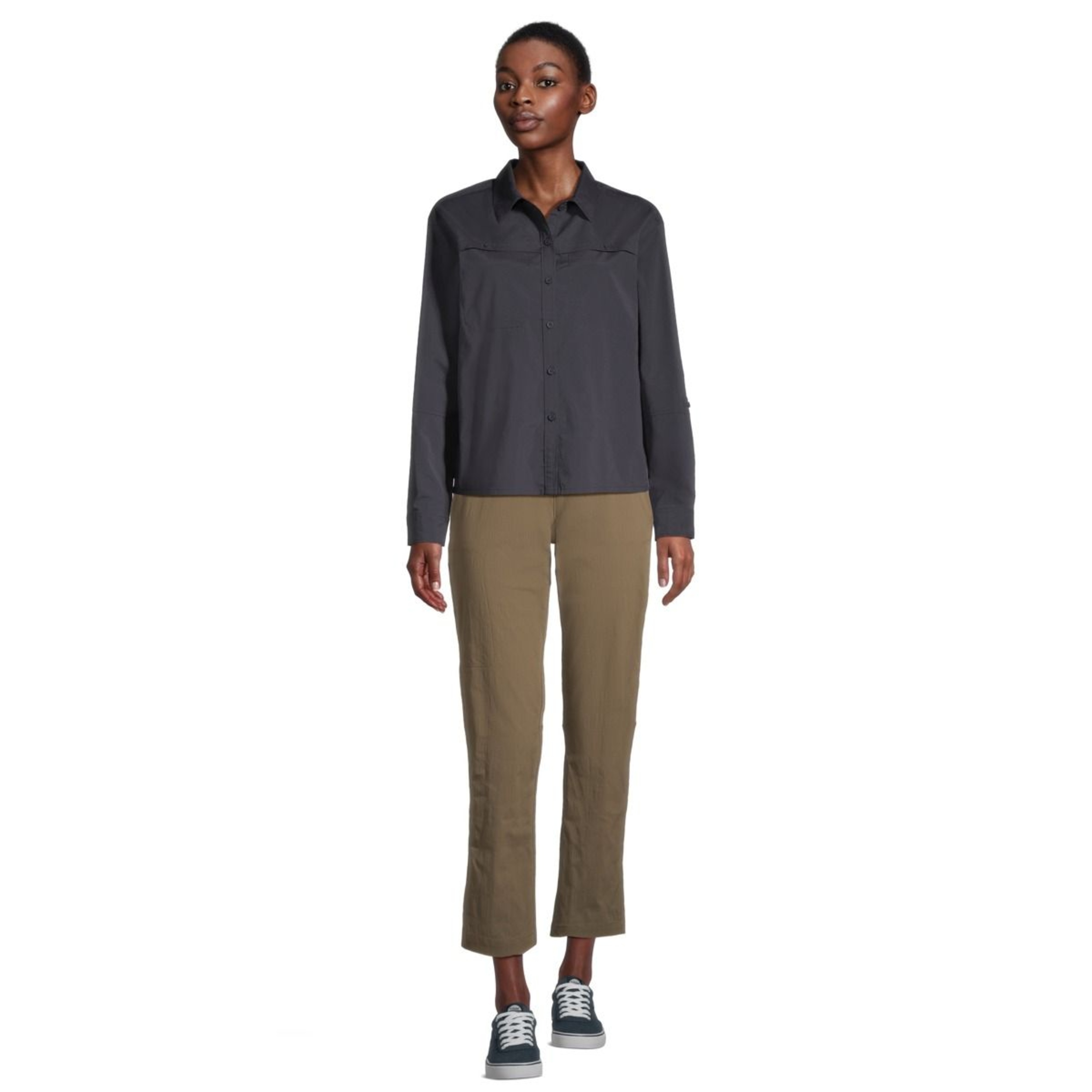 The Woods Women's Robson Utility Shirt is designed for comfort. Crafted from lightweight, stretchy fabric with water-repellent properties, it ensures you stay comfortable in various conditions. The buttoned front, sun-protection collar, and breathable back venting add to its practical design.