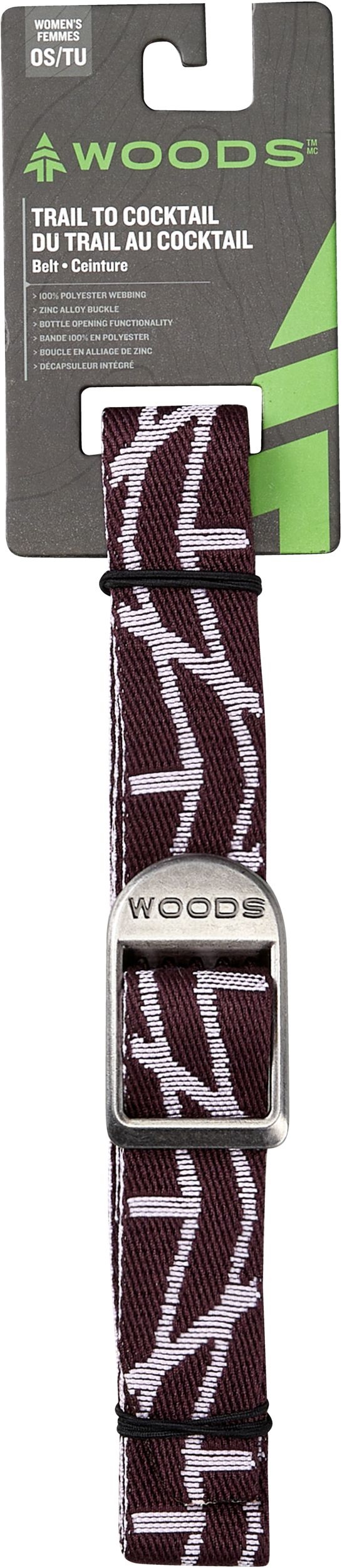The Woods Women's Trail To Cocktail All Over Print Belt is an accessory for your hiking adventures and casual use. It features 100% polyester webbing and a stylish Woods tree pattern print. The zinc alloy clamp buckle includes a built-in bottle opener, allowing you to reward yourself after a refreshing hike. With a total length of 48 inches and a width of 30mm, this All Over Print Belt offers you style and functionality.