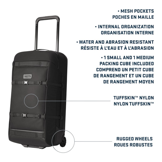 The YETI Crossroads Luggage 29 Inch offers optimal durability with water-resistant and abrasion-resistant TuffSkin™ 700D Nylon. Designed for easy organization, it features a wide opening, multiple carrying handles and removable compression straps. With an interior mesh pocket divider, rugged serviceable wheels and a strong, lightweight polycarbonate base, this handy YETI bag is a durable and convenient travel companion.