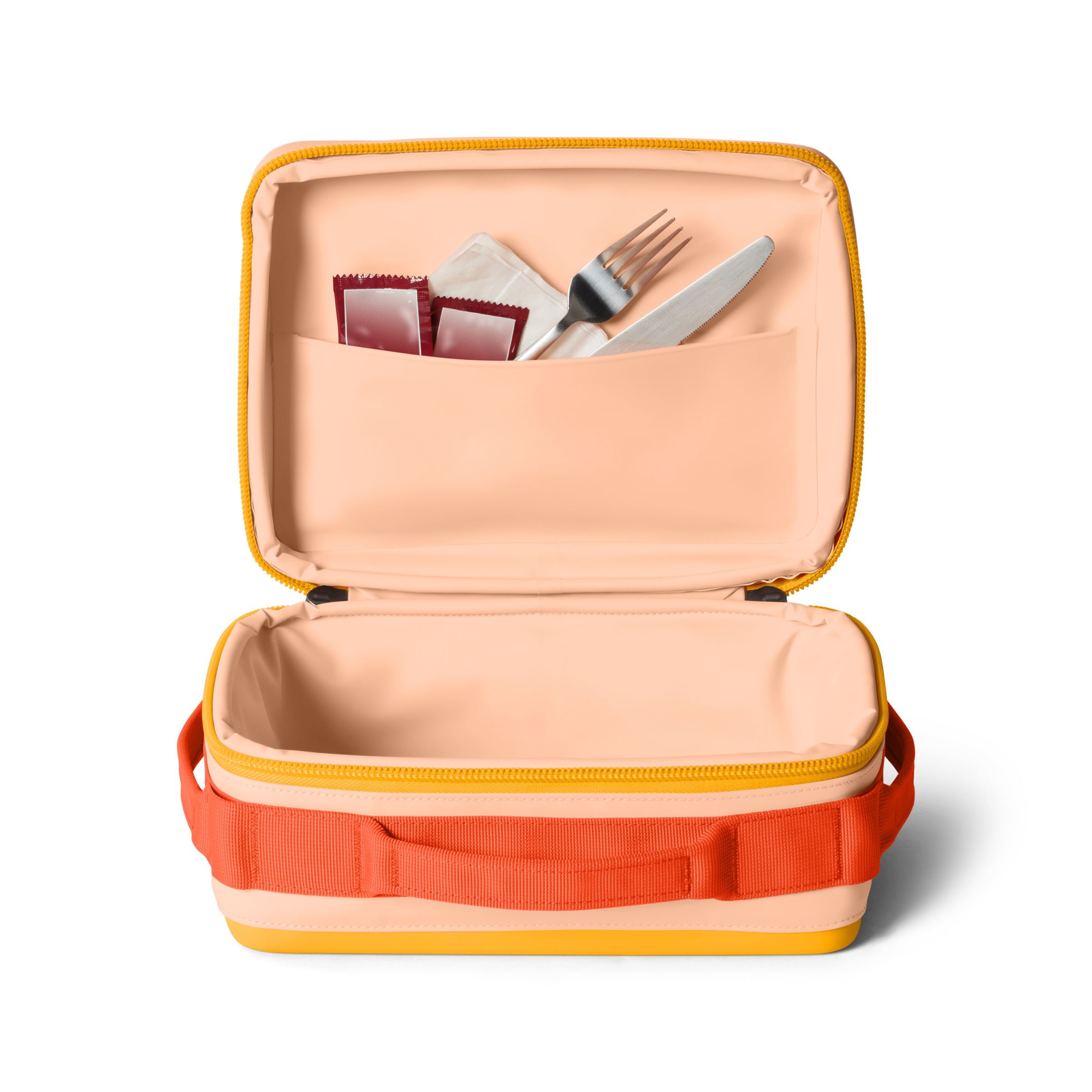 Internal Packattic™ pocket secures utensils and condiments against the lid
