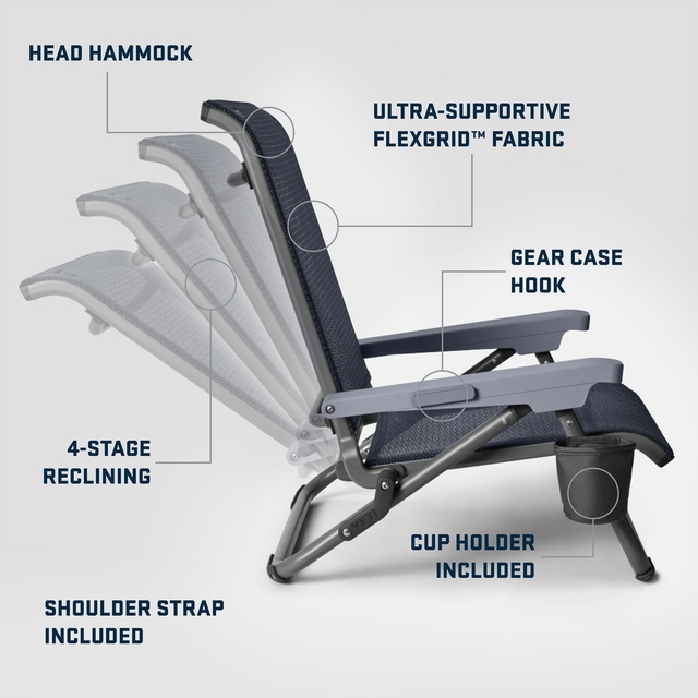 The YETI Hondo Beach Chair is the go-anywhere beach chair that’s portable, comfortable, and as always, durable. Its lightweight frame and shoulder strap accessory make for easy carrying while the ultra-supportive FlexGrid™ Fabric provides a comfortable landing once you’ve reached that perfect stretch of sand. With four reclining positions and an ergonomic waterfall edge, this beach chair makes it easy to take it easy.