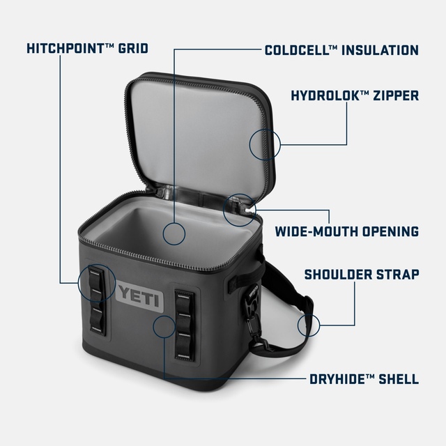 The YETI Hopper Flip® 12 Soft Cooler Bag is a resilient, leak-proof companion for your outdoor adventures. Coldcell Insulation keeps contents cold while a Hydrolok Zip provides secure, waterproof protection. Built to withstand the elements, this sturdy-but-soft cooler features a dense outer fabric that resists water, mold, punctures, and UV rays. This compact cooler has enough interior capacity to hold 24 cans or 7 kg of ice, with a wide opening that allows for easy loading and access.
