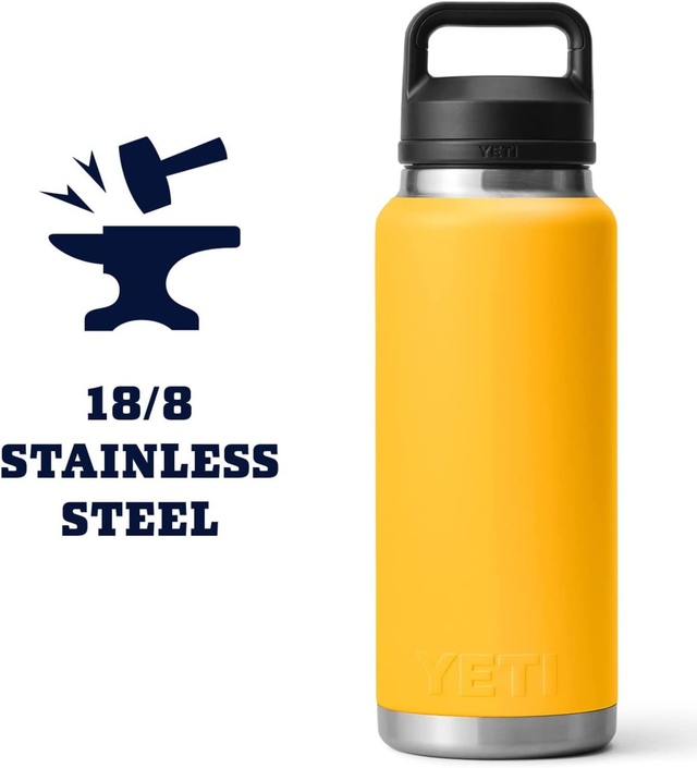 The YETI Rambler® 36 oz Water Bottle with Chug Cap is designed for a life in the wild. Scorching days on the ranch and keeping you hydrated through rugged terrain are this bottle’s calling, second only to keeping your drinks icy cold (or perfectly hot).With a quick twist, the TripleHaul™ handle comes off, exposing the shatter-resistant, dishwasher safe spout that allows for controlled gulps on the go. When it’s time for a wash or refill, remove the entire cap to expose the bottle’s wide mouth. Find a color that calls to you –these big bottles are available in stainless and DuraCoat™ finishes.