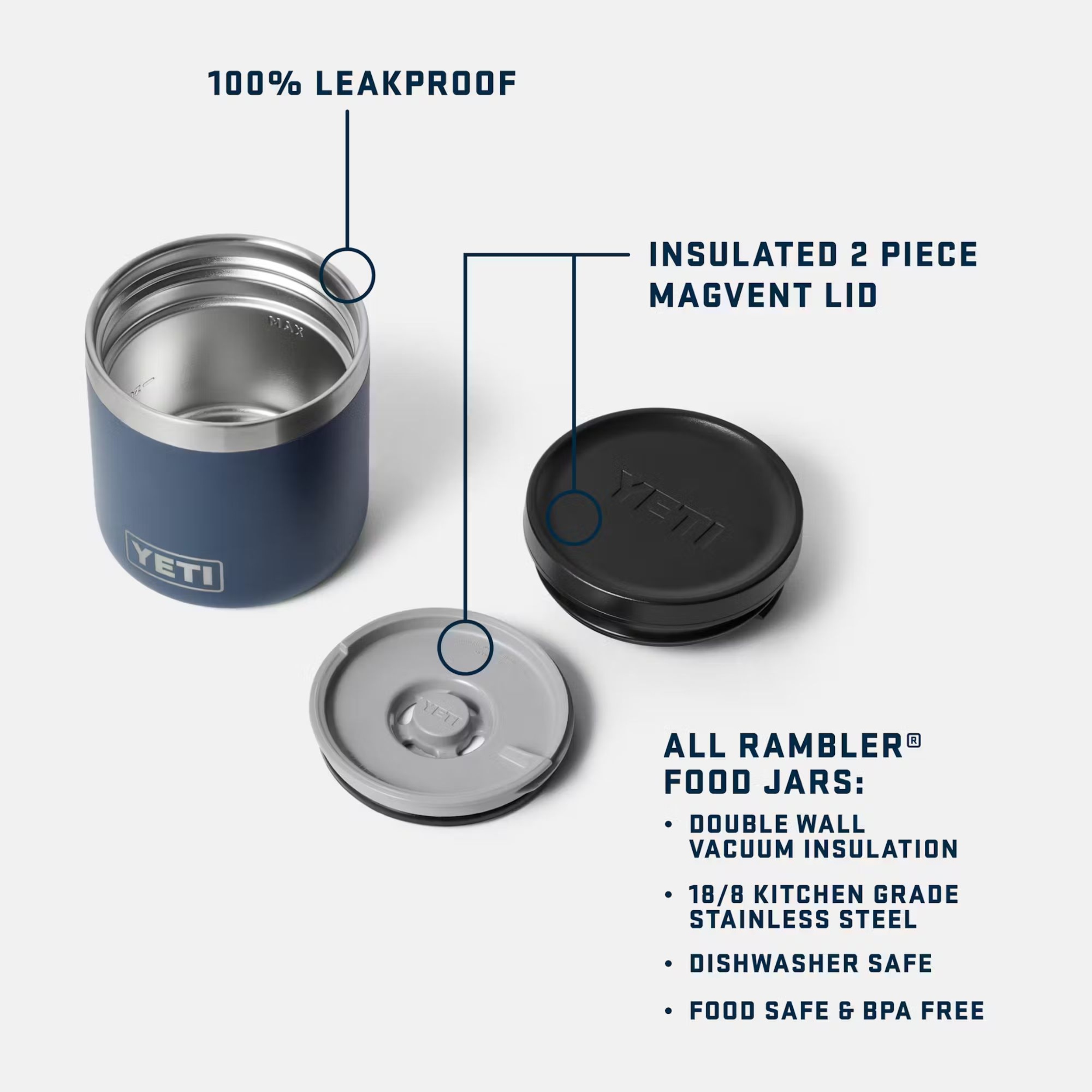 Stay energized on the go with the YETI ® Rambler® 8 oz Insulated Food Jar. Perfect for keeping your meals at the right temperature, this food jar features double-wall vacuum insulation to maintain hot or cold conditions. The 100% leakproof MagVent lid ensures you can carry it in your bag without any spills.