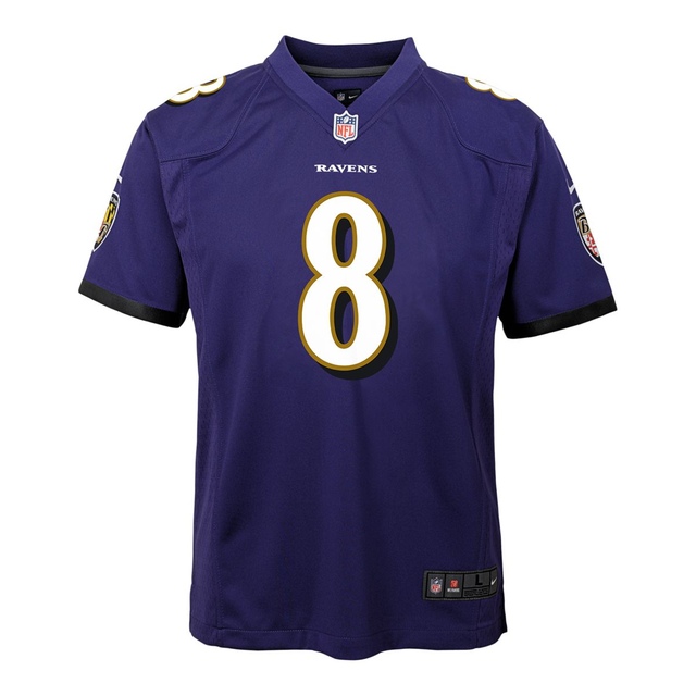 Represent the Baltimore Raves in proper form with this youth Nike game jersey. Made from durable polyester fabric with mesh side panels for breathability, it features all the details an enthusiastic young NFL fan loves. The clean finished seams, screen printed name and number, stitched shield logo and satin twill jock tag make this top the perfect choice for game days or cheering on your favourite player, Lamar Jackson. Officially licensed and with an athletic fit, this jersey allows you to show your Ravens pride in comfort.