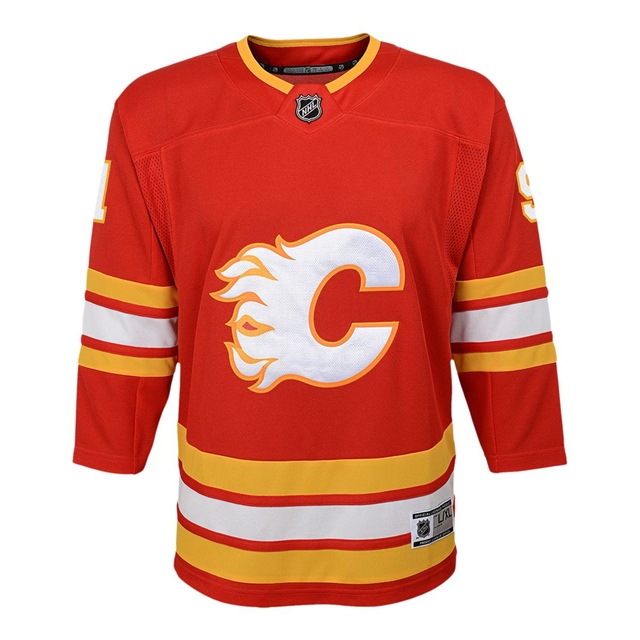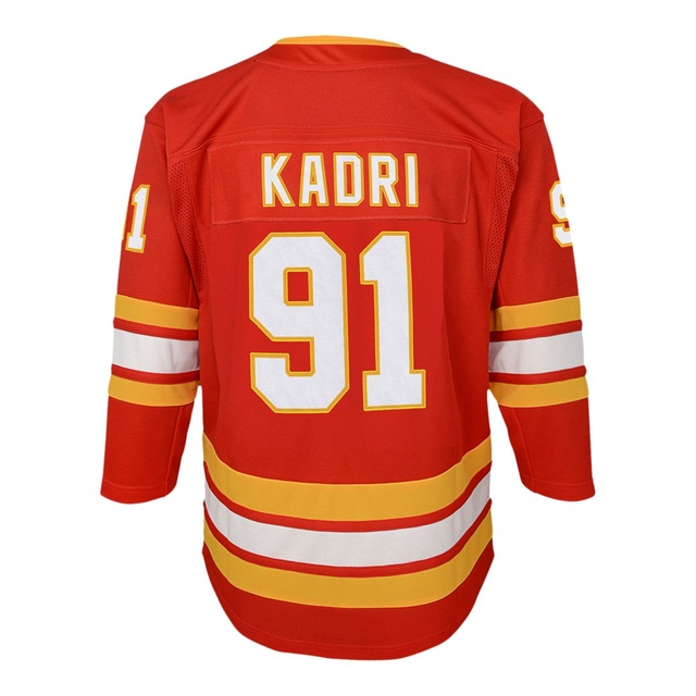 Represent the C of Red in the Calgary Flames NHL Premier team color red home jersey. Iconic retro design with modern fabrication. Complete with Nazeem Kadri #91 name and number. This is a must have jerseys for any young Flames fan. Officially licensed by the NHL and NHLPA. Youth 8-20 size range.