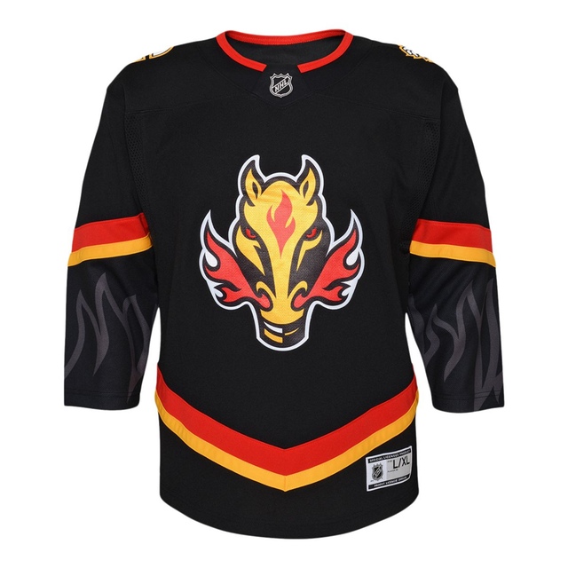 Blasty the Horse has returned in the new 2023-2024 Calgary Flames NHL 3rd Alternate Premier black jersey. Iconic alternate logo center chest with modern design and fabrication. This is a must have jerseys for any young Flames fan. Officially licensed by the NHL. Youth 8-20 size range.