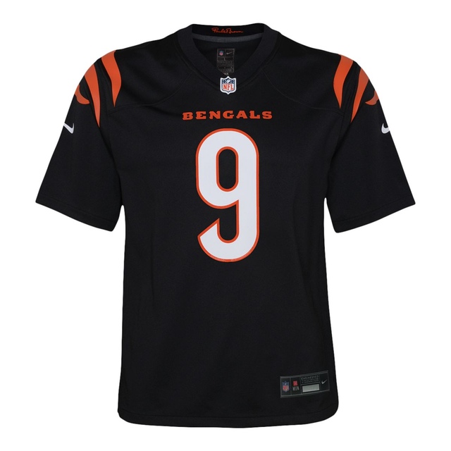 Cheer on the Cincinnati Bengals in the youth Nike NFL Game Jersey in team colour with authentic Joe Burrow #9 name and number. Made for the enthusiastic young NFL fan.