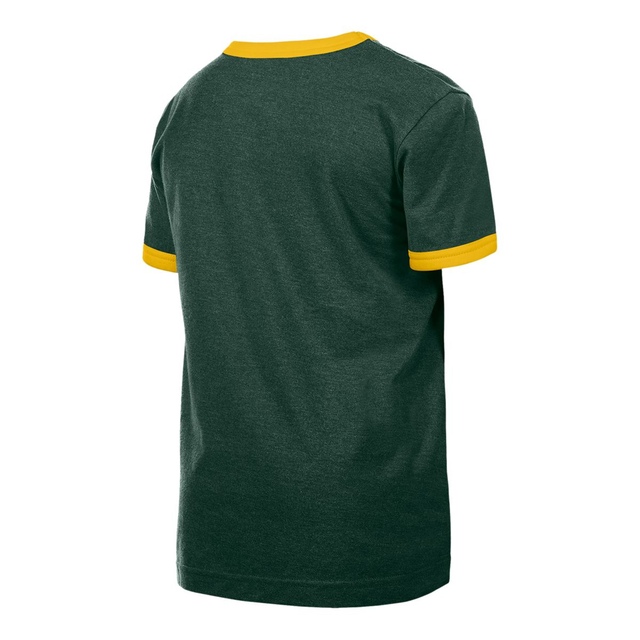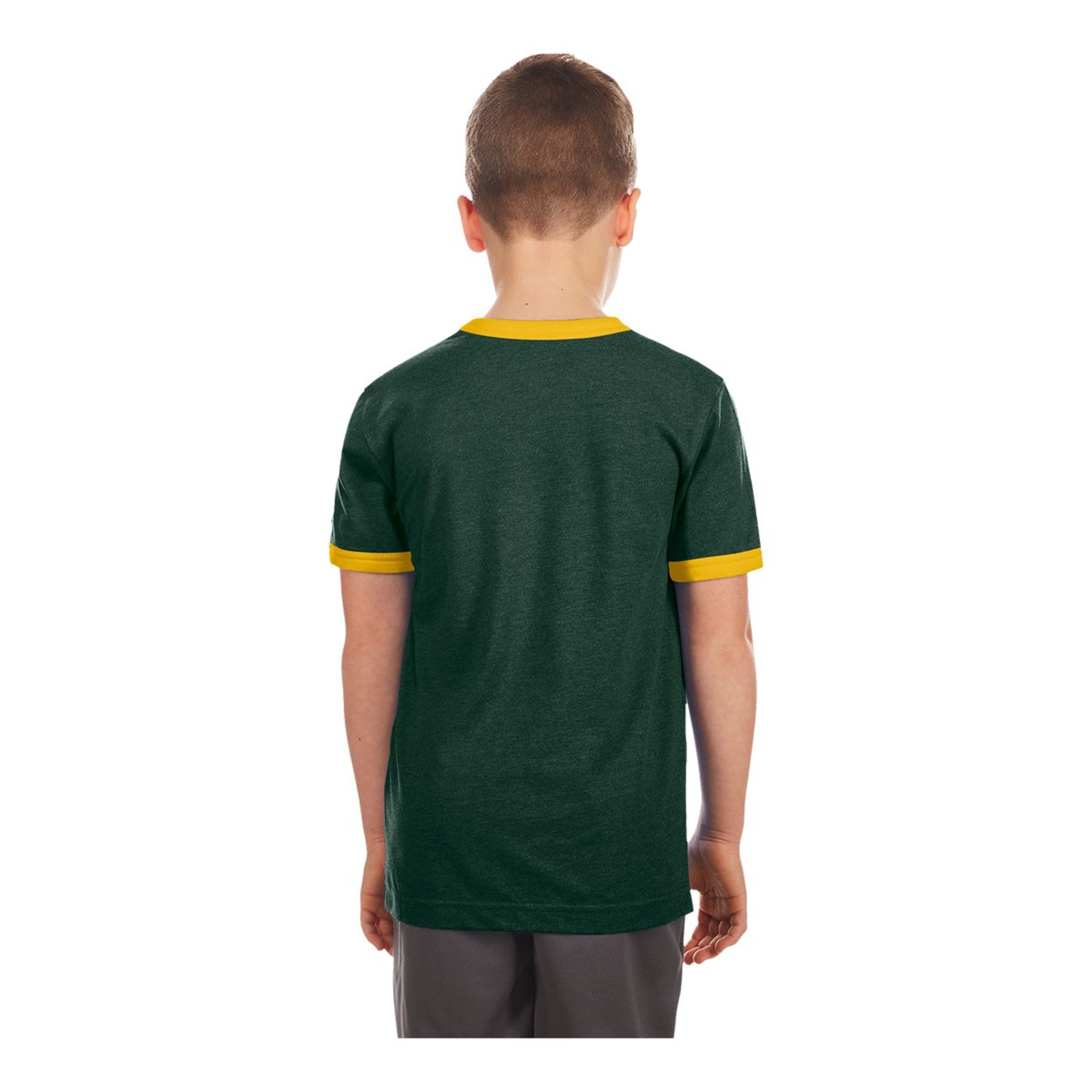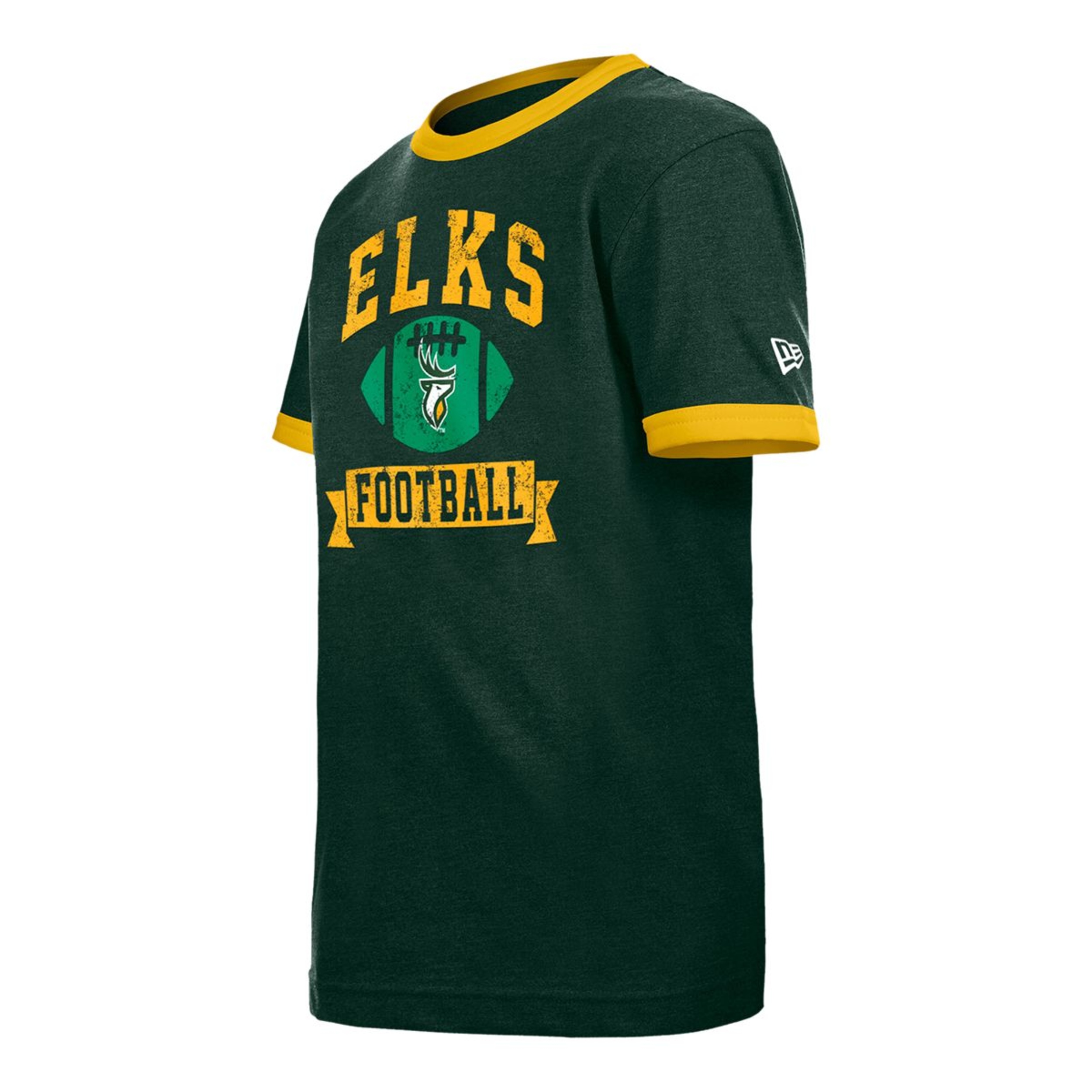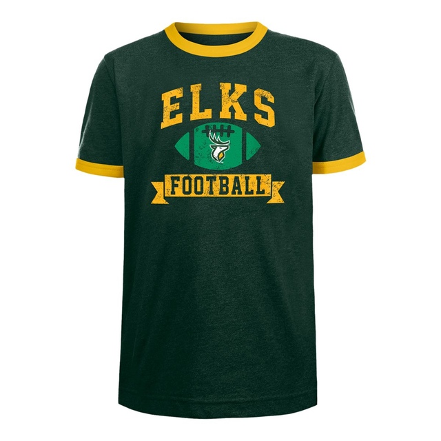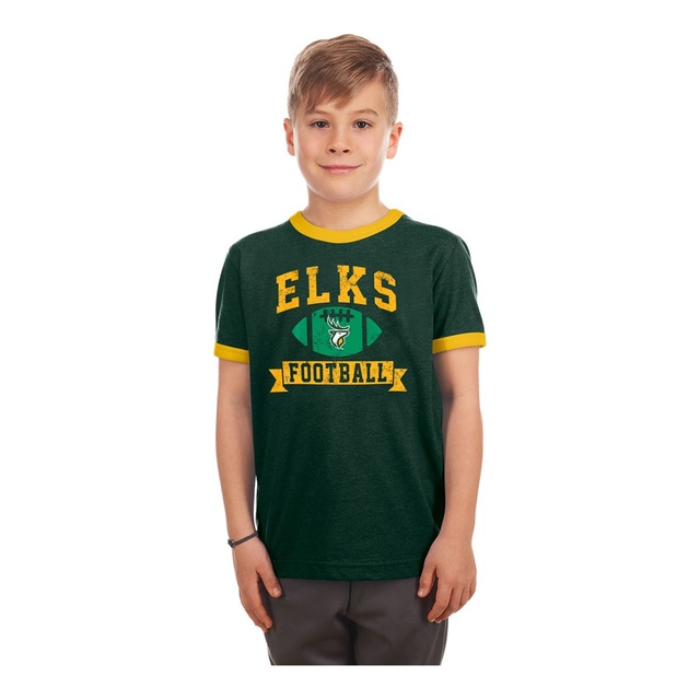 Youth CFL Ringer Tee. Team color heathered tee with contrasting team color neck and sleeve trim. Football graphic with team primary logo and wordmark on front.