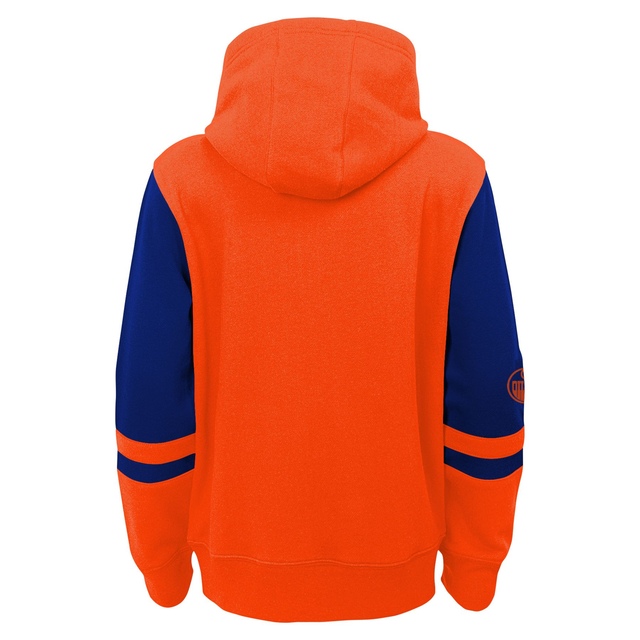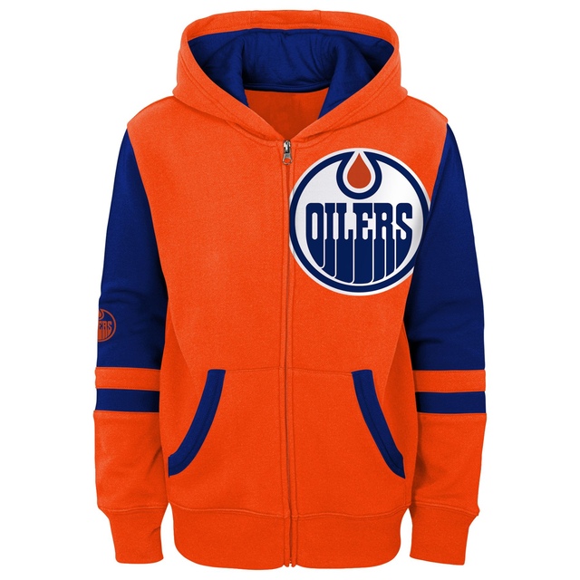 Perfect for layering up in colder weather, this Edmonton Oilers Faceoff full-zip hoodie provides cozy warmth while watching your favourite team on the ice! It features fleece lining for extra softness, a hood for additional coverage and pockets to warm up hands. The color-blocked design also draws attention to growing Edmonton Oilers fandom.