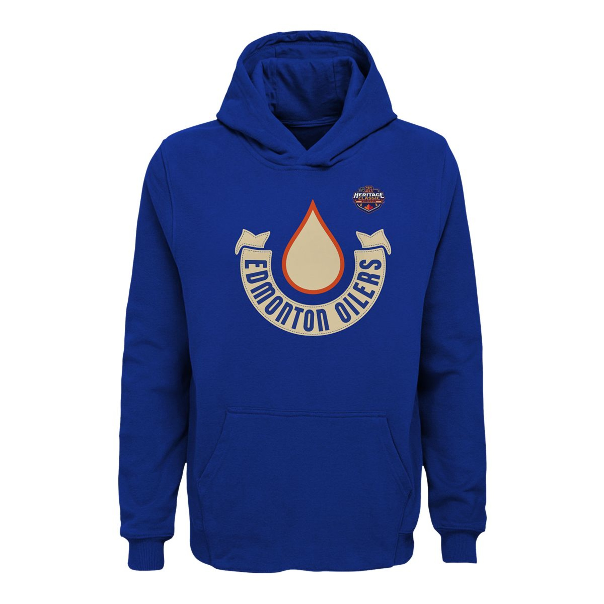 Commemorate the 2023 NHL Heritage Classic with the Oilers HC23 Jersey Crest logo pullover fleece hood. Team color fleece with Oilers HC23 vintage logo screen printed on front. Officially licensed by the NHL. Comfortable 60% cotton and 40% polyester fabrication. Youth 8-20 sizing.