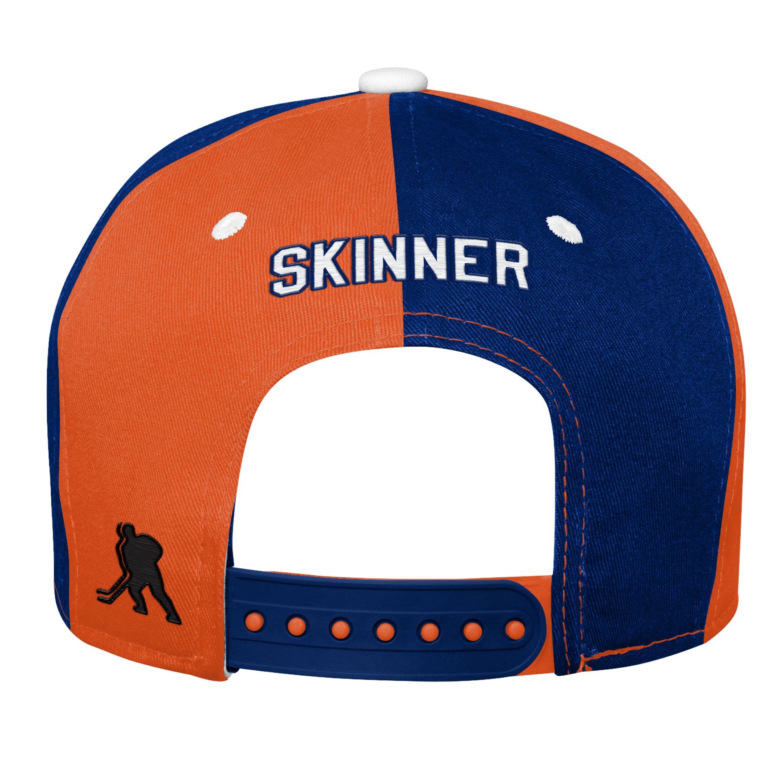 The Youth Edmonton Oilers Skinner Cap lets young fans represent their favorite National Hockey League team and player in style. This snapback cap features a pinwheel design showcasing the Edmonton Oilers colours and alternate hues. The front right panel boasts an embroidered team logo, while the left panel displays Skinner's number. The flat visor sports the iconic Edmonton Oilers crest, and Skinner's name graces the back. A two-tone plastic snap closure ensures a customized fit.