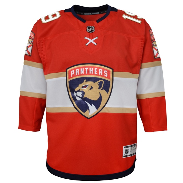 The Youth Florida Panthers Outerstuff Tkachuk Jersey captures the authentic on-ice look for young hockey enthusiasts. This officially licensed National Hockey League (NHL) jersey boasts Florida Panthers' embroidered team crest and twill player details for unmatched team spirit. Its semi-dull mesh fabrication and polyester interlock knit collar ensure breathable comfort during energetic play, while side seam gussets allow unrestricted mobility. A must-have for passionate NHL fans.