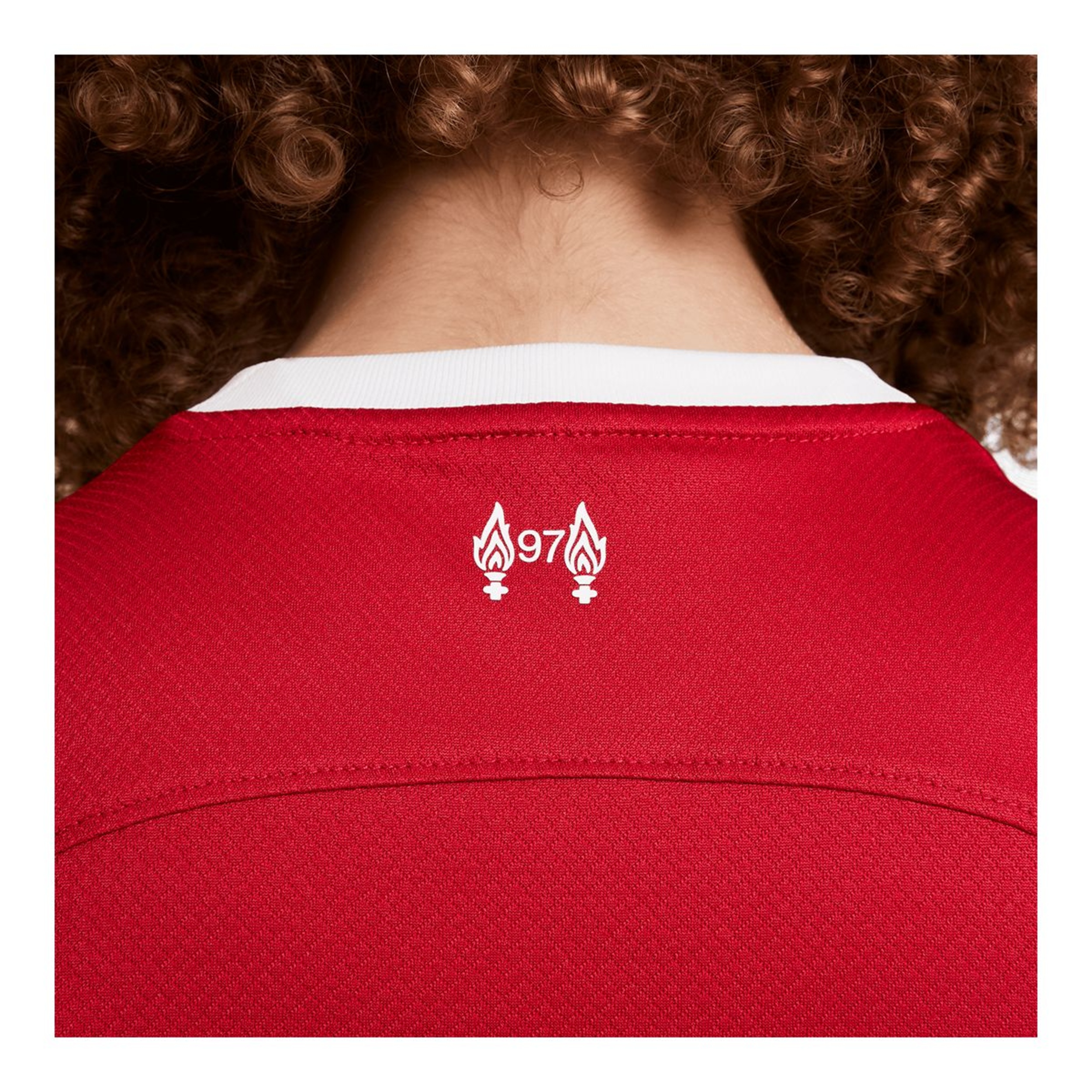 Packed with details, the Liverpool FC 2023/24 Home jersey remembers the 97 people who tragically died in the Hillsborough Disaster. A 97 set between two eternal flames resides on the inner pride while white accents at the collar and sleeves nod to a jersey the legendary ’74 squad wore. Nike’s Stadium collection pairs replica design details with sweat-wicking technology to give you a game-ready look inspired by your favorite team.
