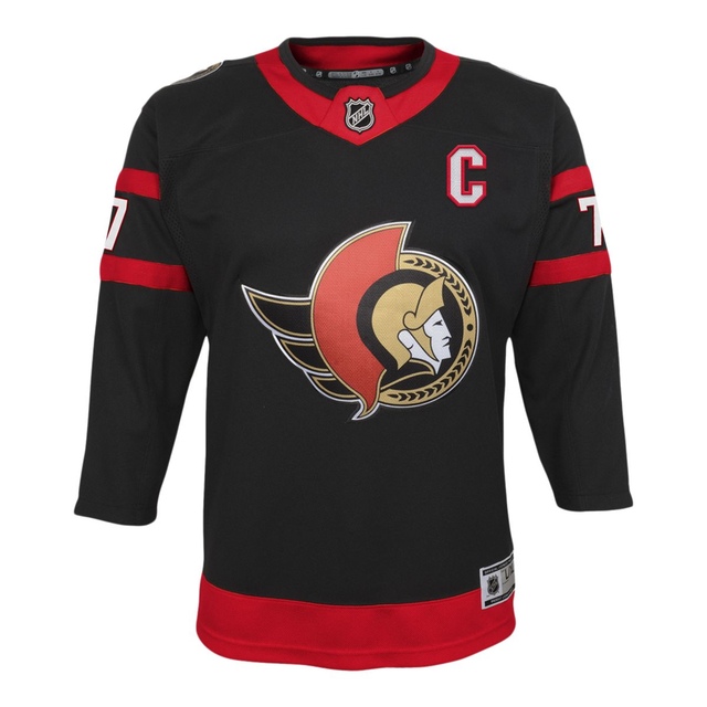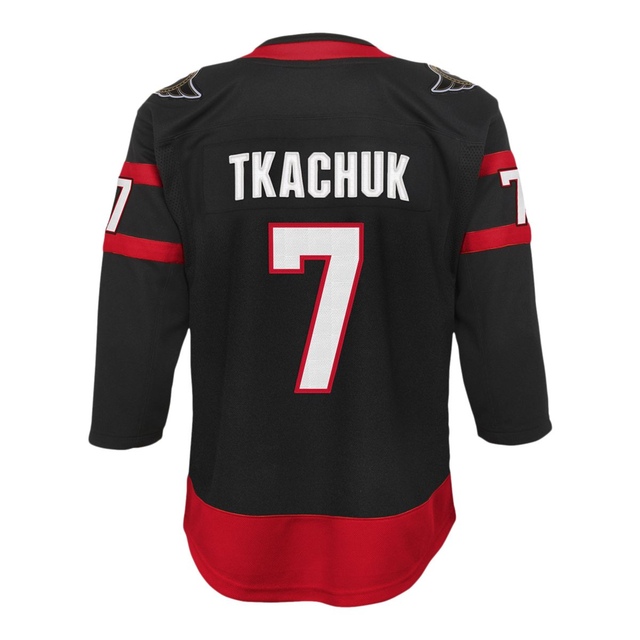 The Ottawa Senators NHL Premier team color black home jersey provides an iconic and bold look. Design, color, and fabrication that pays tribute to the Sens history. Complete with Brady Tkachuk #7 name and number. This is a must have jerseys for any young Sens fan. Officially licensed by the NHL and NHLPA. Youth 8 to 20 size range.