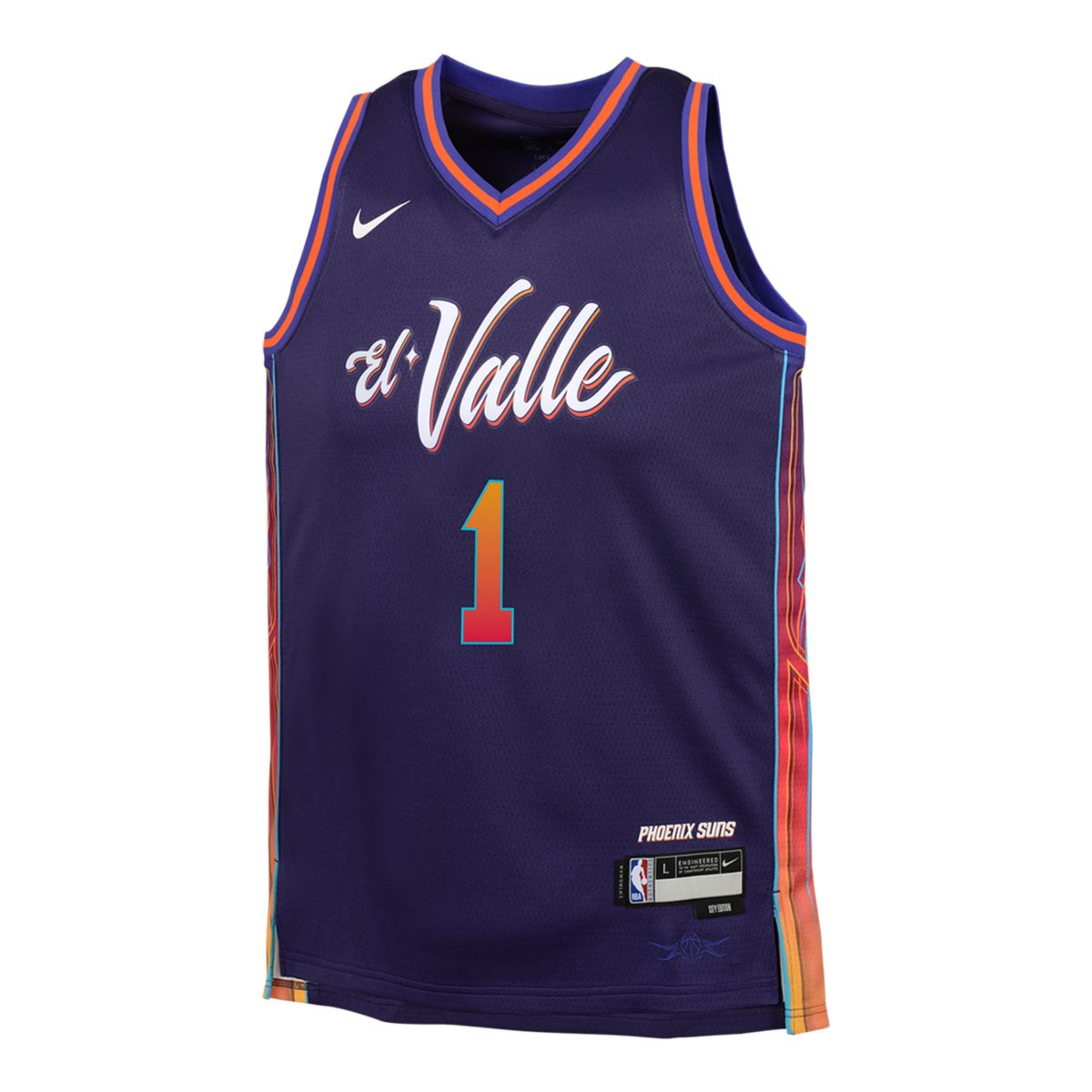 Young NBA fans can celebrate the Suns in the 2023 - 2024 City Edition Swingman jersey by Nike. Complete with Devin Booker player name and number. Nike Dri-Fit premium double knit mesh fabrication. Directly inspired by the on court NBA jersey. Officially licensed by the NBA. Youth 8-20 size range.