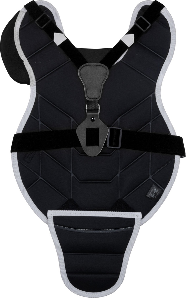 The chest protector includes multi-adjustable straps, lightweight padding, and meets NOCSAE® standards for Youth and Junior models
