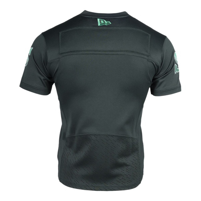 The Youth Saskatchewan Roughriders New Era Replica Third Jersey showcases a fresh Obsidian Green alternate colorway for young fans of the CFL team. This officially licensed jersey features a brand new stylized version of the iconic "S" logo emblazoned on the sleeves and "SASKATCHEWAN" embroidered in Emerald Green across the front just below the collar.
