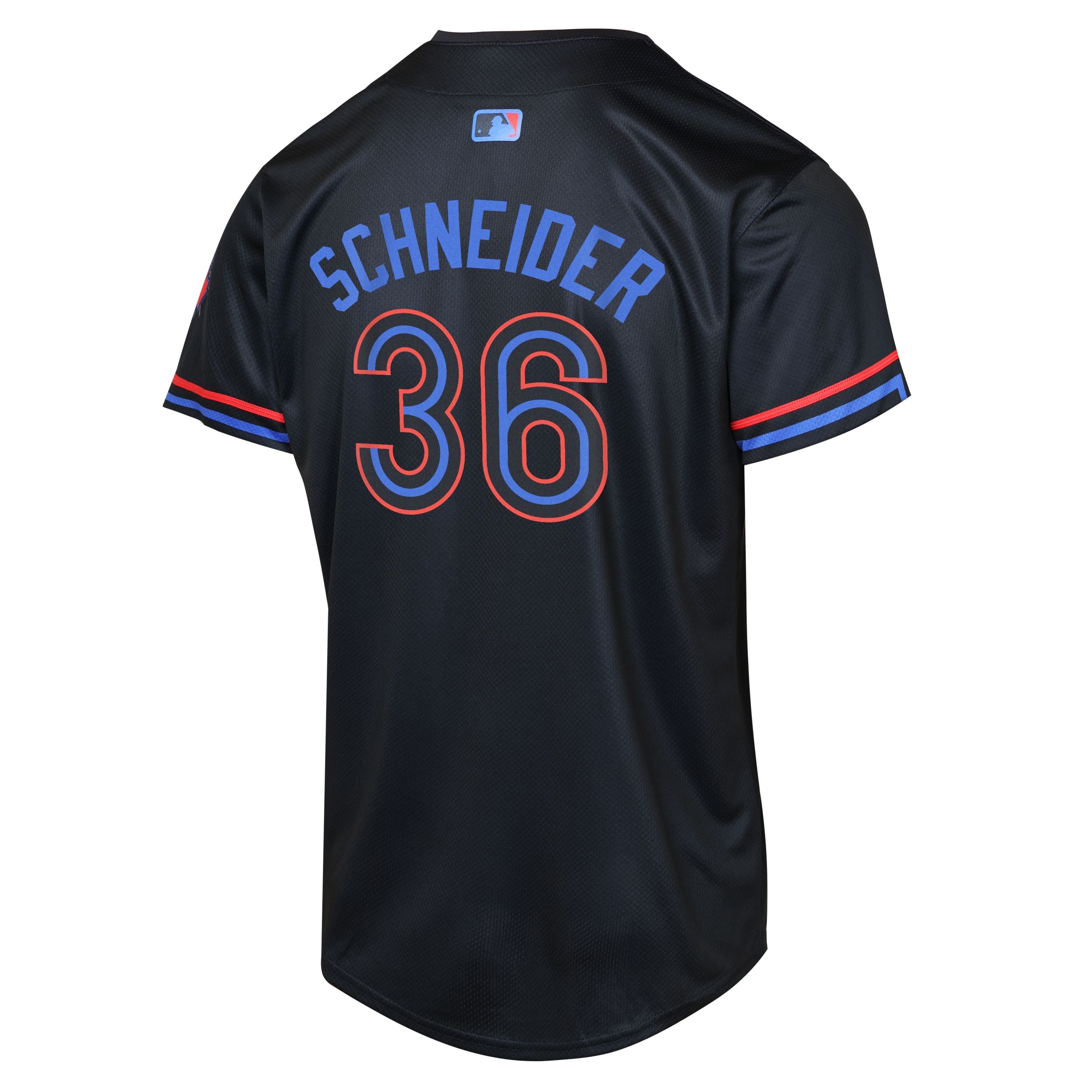 Inspired by the City of Toronto, the new Blue Jays Nike Limited City Connect jersey with Davis Schneider player name and number is a must-have for every young fan. Innovative design based on a dark pitch blue body colour featuring the iconic Toronto cityscape, Toronto wordmark, and Blue Jays logo on the left sleeve. Developed to deliver an authentic look and feel by using lightweight stretch mesh fabric and twill details. Nike's innovative Vapor Premier chassis allows for flexible movement combined with Dri-FIT ADV moisture management technology to deliver ultimate comfort. Youth size range.