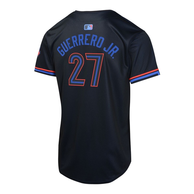 Show your support with the Toronto Blue Jays Nike Youth Vladimir Guerrero Jr. City Connect Jersey. Featuring a dark Pitch Blue body with the iconic cityscape, Toronto wordmark, and Blue Jays logo on the left sleeve, this jersey is designed for comfort. The lightweight stretch mesh fabric and twill details ensure flexible movement, while Nike's Vapor Premier chassis enhances mobility for young fans on the go.