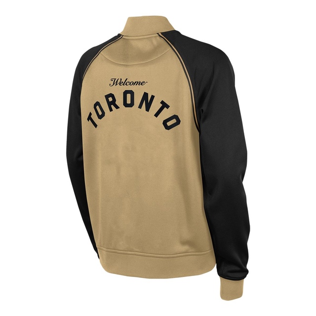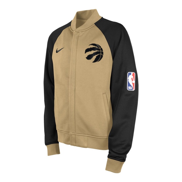 Young Raptors fans can celebrate Toronto in the 2023 - 2024 City Edition Showtime long sleeve full zip warm up jacket by Nike. Two color Raptors gold and black design. Raptors icon logo at left chest with Toronto call out on center back. Nike Dri-Fit Therma fleece with polyester double knit fabrication. Officially licensed by the NBA. Youth 8-20 size range.