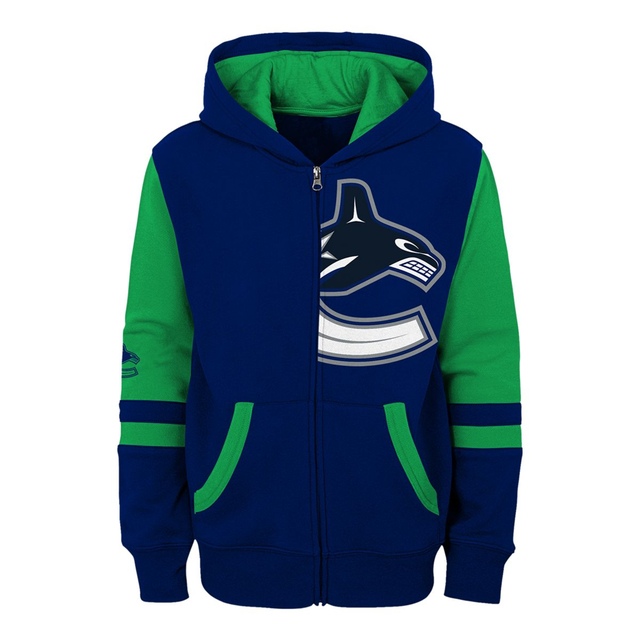 The NHL Face Off Full Zip fleece hood is a core staple for any young NHL Fan. Team and alternate colour based design with oversived team logo at left center chest. Comfortable cotton polyester blended fleece fabrication. Relaxed styling with full length zip and utility pockets. Contrast jersey lined three panel hood. Officially licensed by the NHL. Youth 8-20 size range.