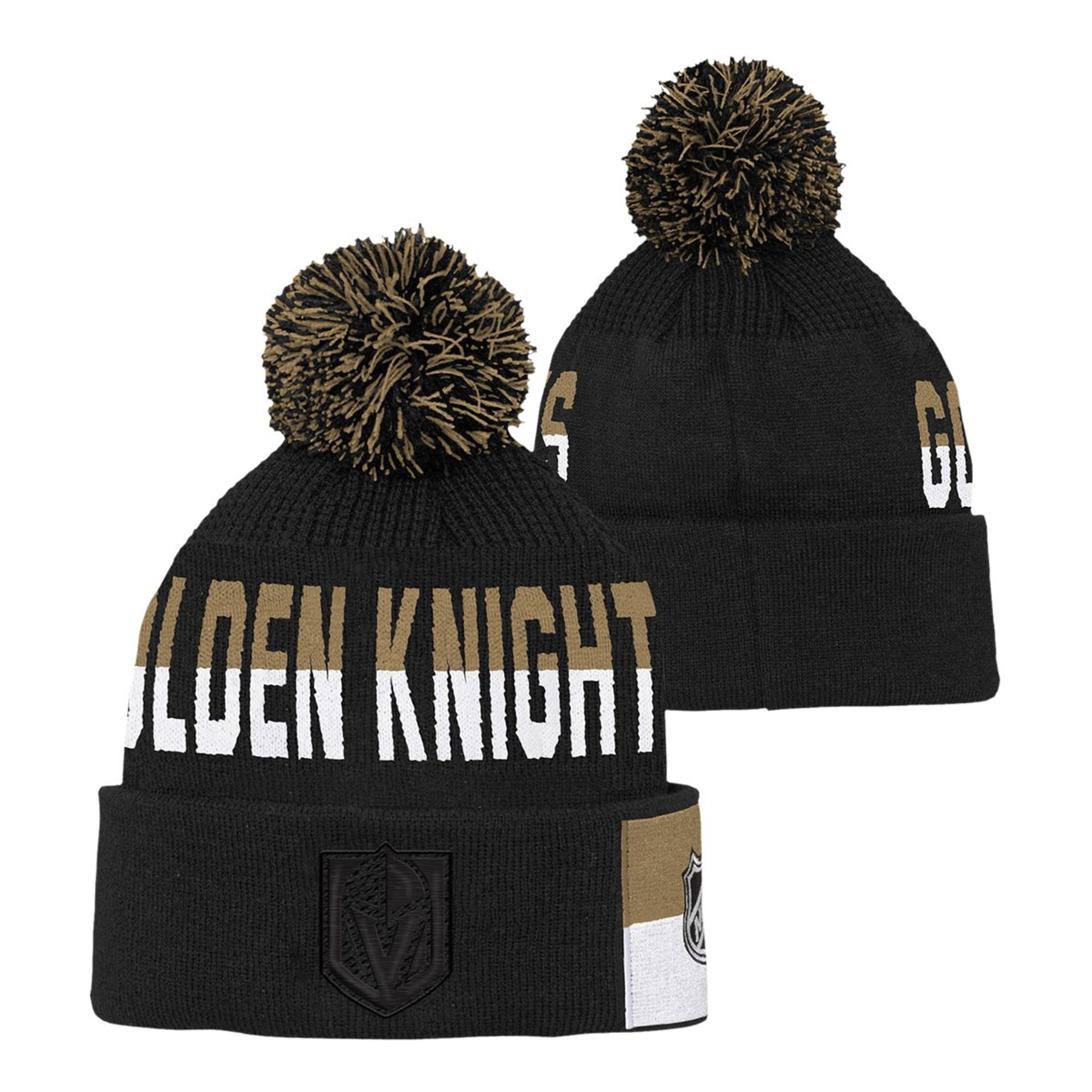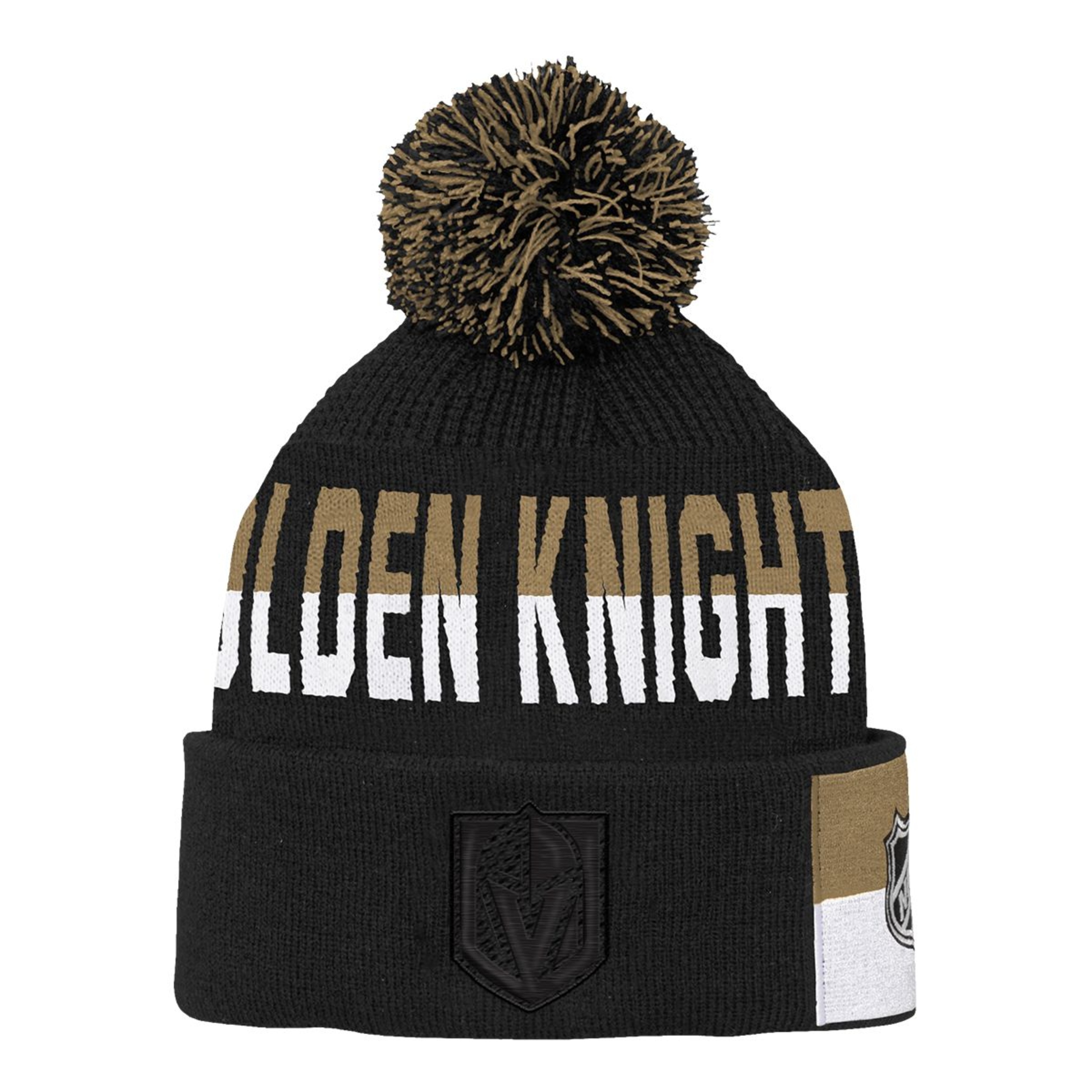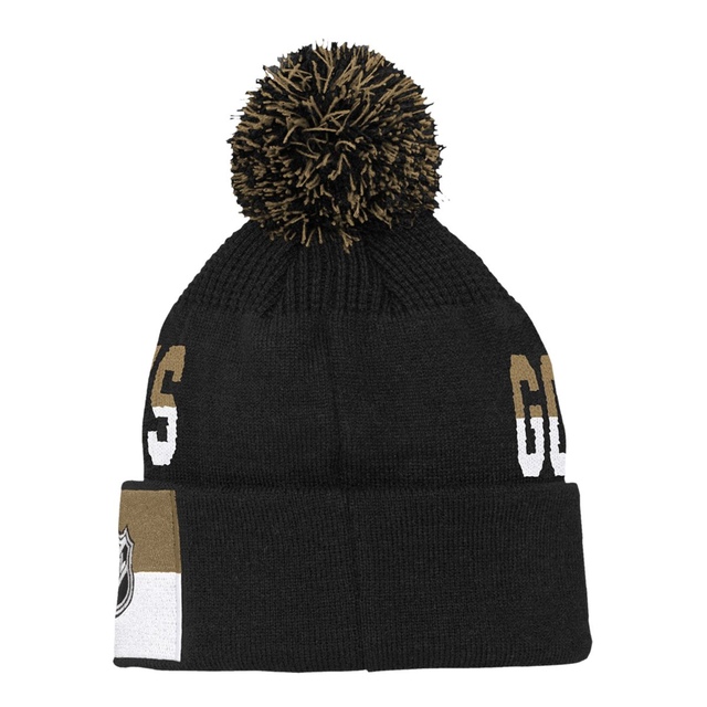 The tonal team color NHL Face Off Jacquard Pom Knit is a super cool trend forward design for any young Vegas Golden Knights fan. Tonal raised embroidered team logo on front, blocked stripes on left cuff, waffle knit crown, flat knit 2 tone team workmark, and mixed color Pom. Youth sizing.